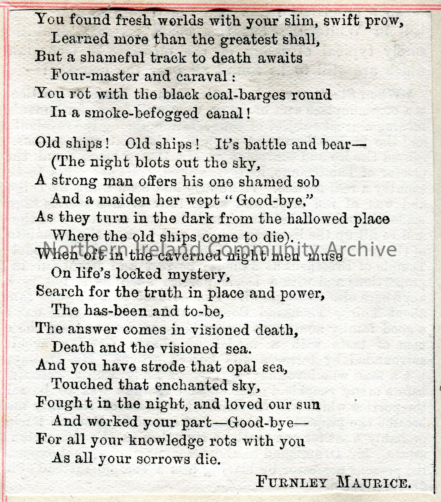 Cutting of a poem from a publication titled, 'Old Ships' by Furnley Maurice.