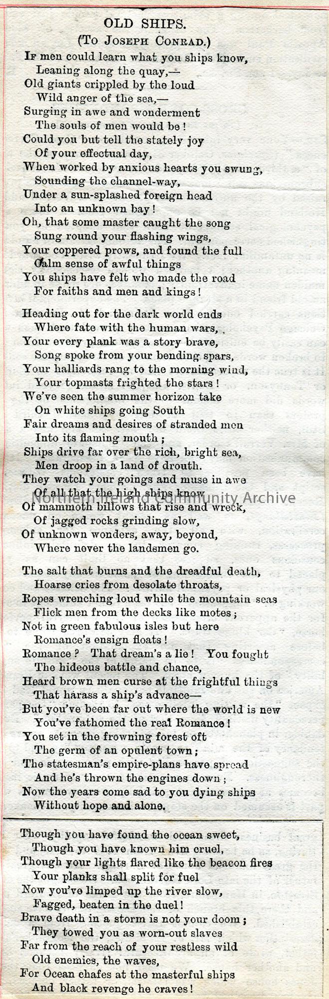 Cutting of a poem from a publication titled, ‘Old Ships’ by Furnley Maurice.