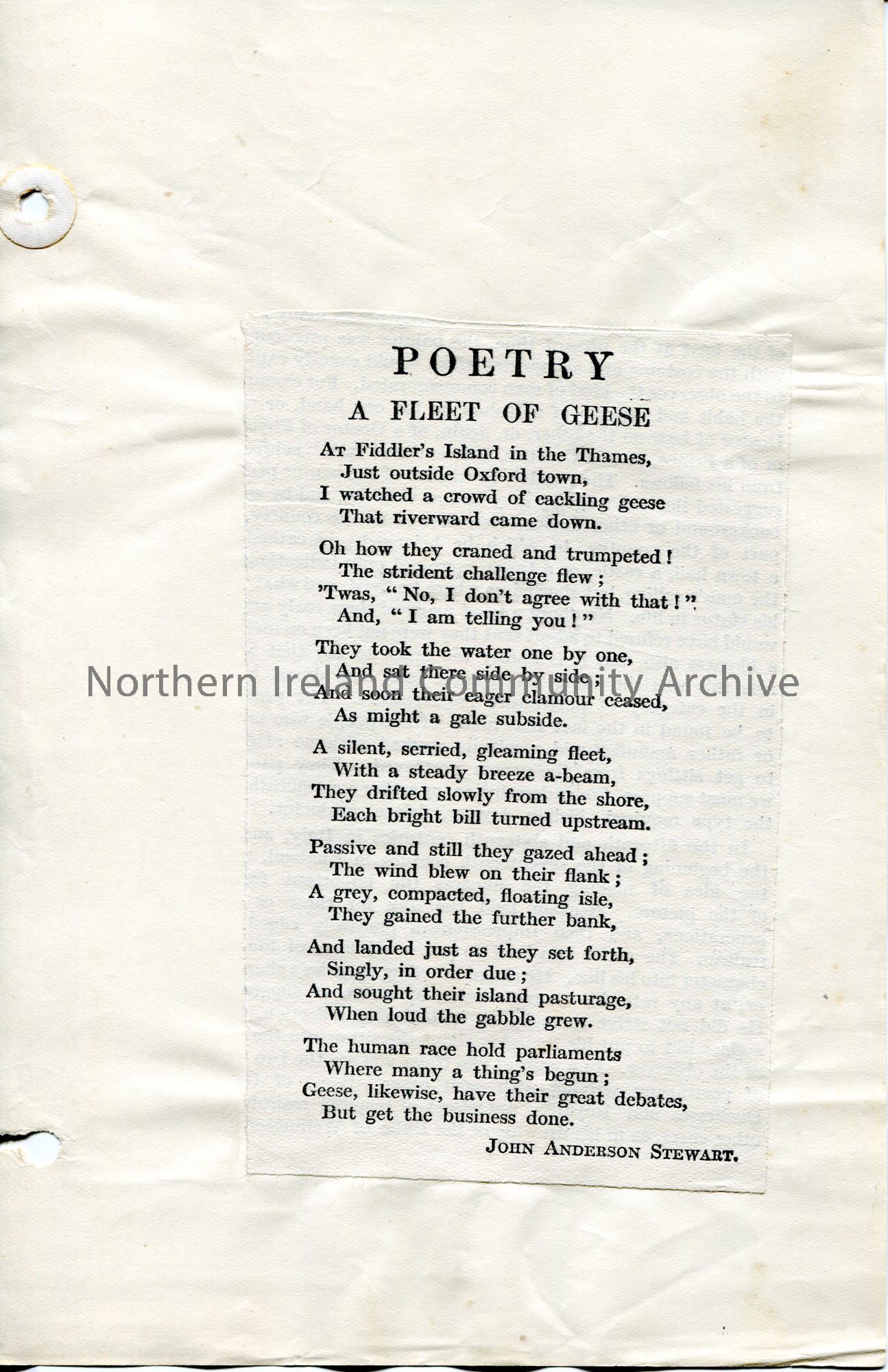 Cutting of a poem pasted to page. Titled, ‘Poetry. A Fleet of Geese’. By John Anderson Stewart.