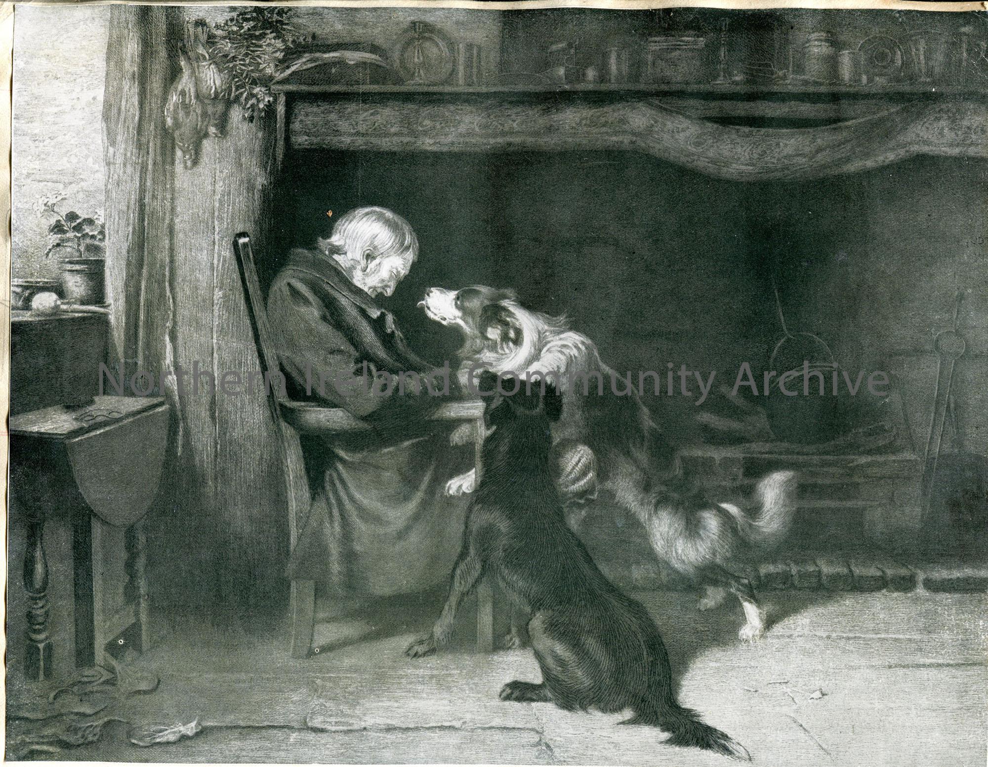 Cutting of a printed image of a man sleeping on a chair in front of a large, open hearth with two dogs looking for his attention.