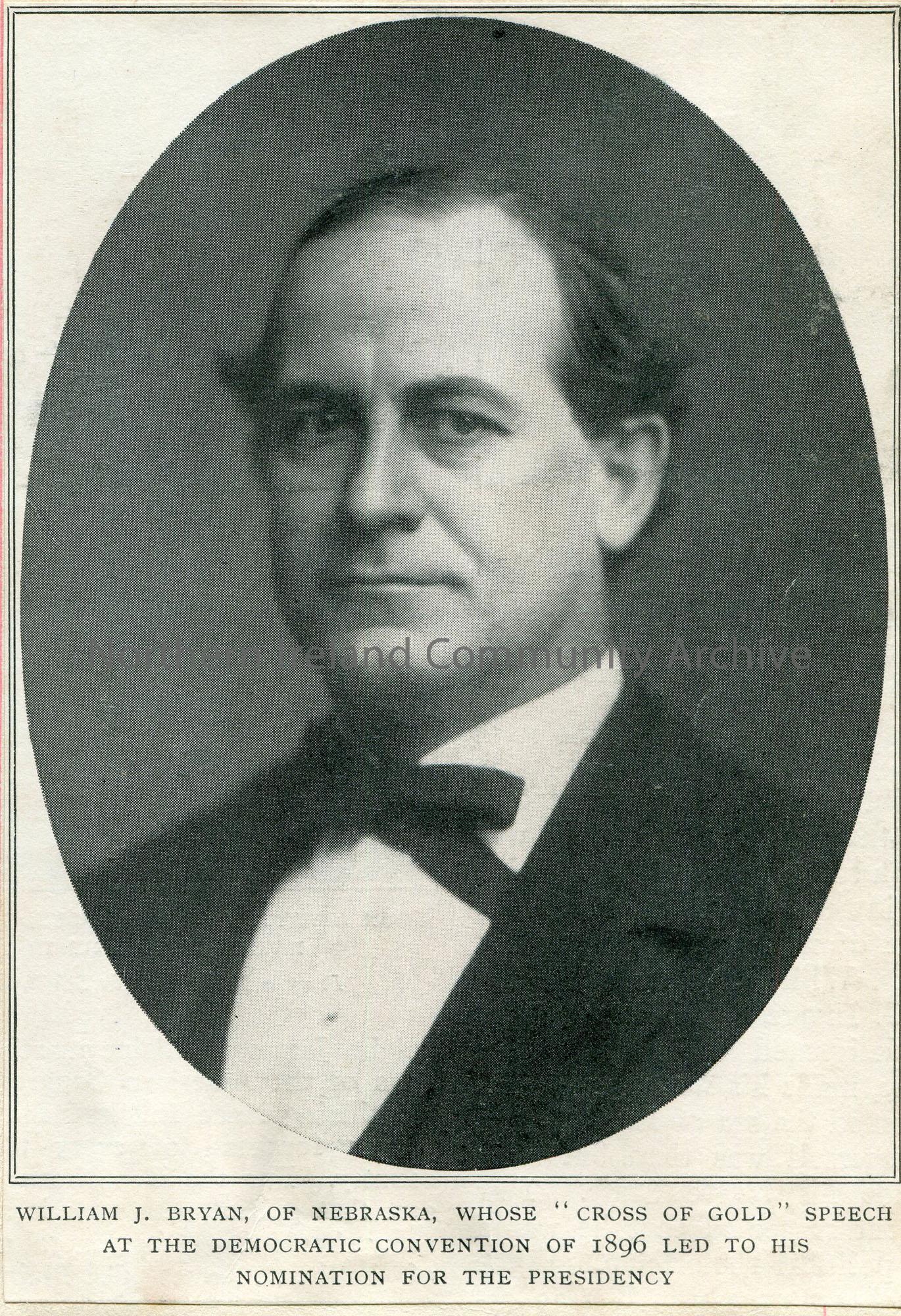 Cutting of a printed image of William J. Bryan of Nebraska who was nominated in 1896 for Presidency.
