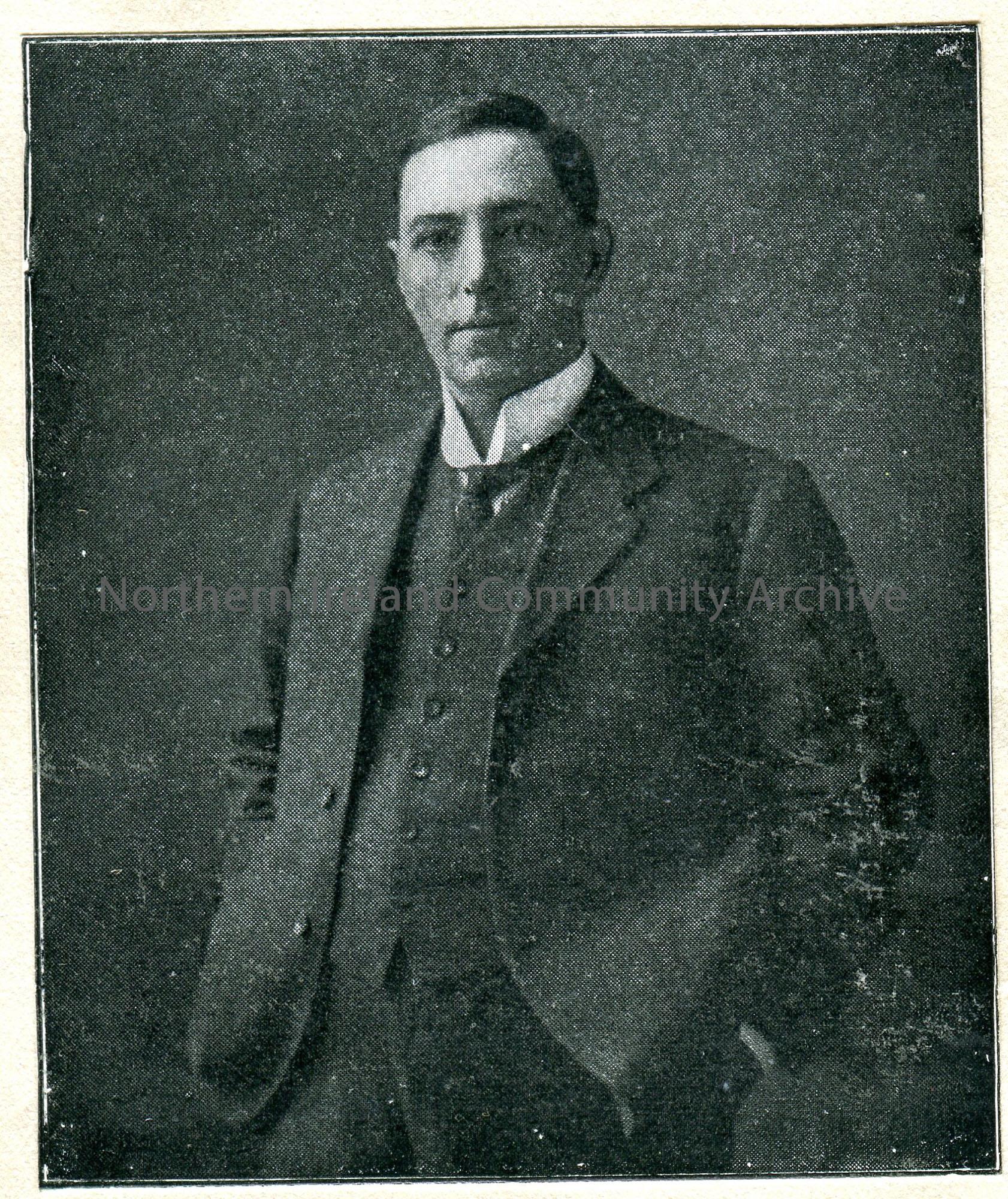 Cutting of a printed photographic image of a man standing with his hands in his pockets. Captioned, ‘Will Owen’.