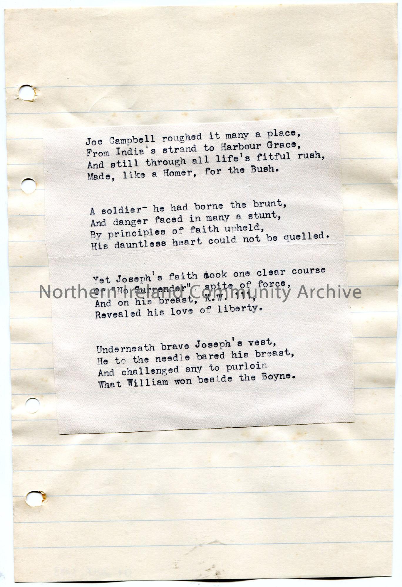 Cutting of a typed poem stuck to lined paper. Untitled. Mentions Joe Campbell and William of Orange, Battle of the Boyne.