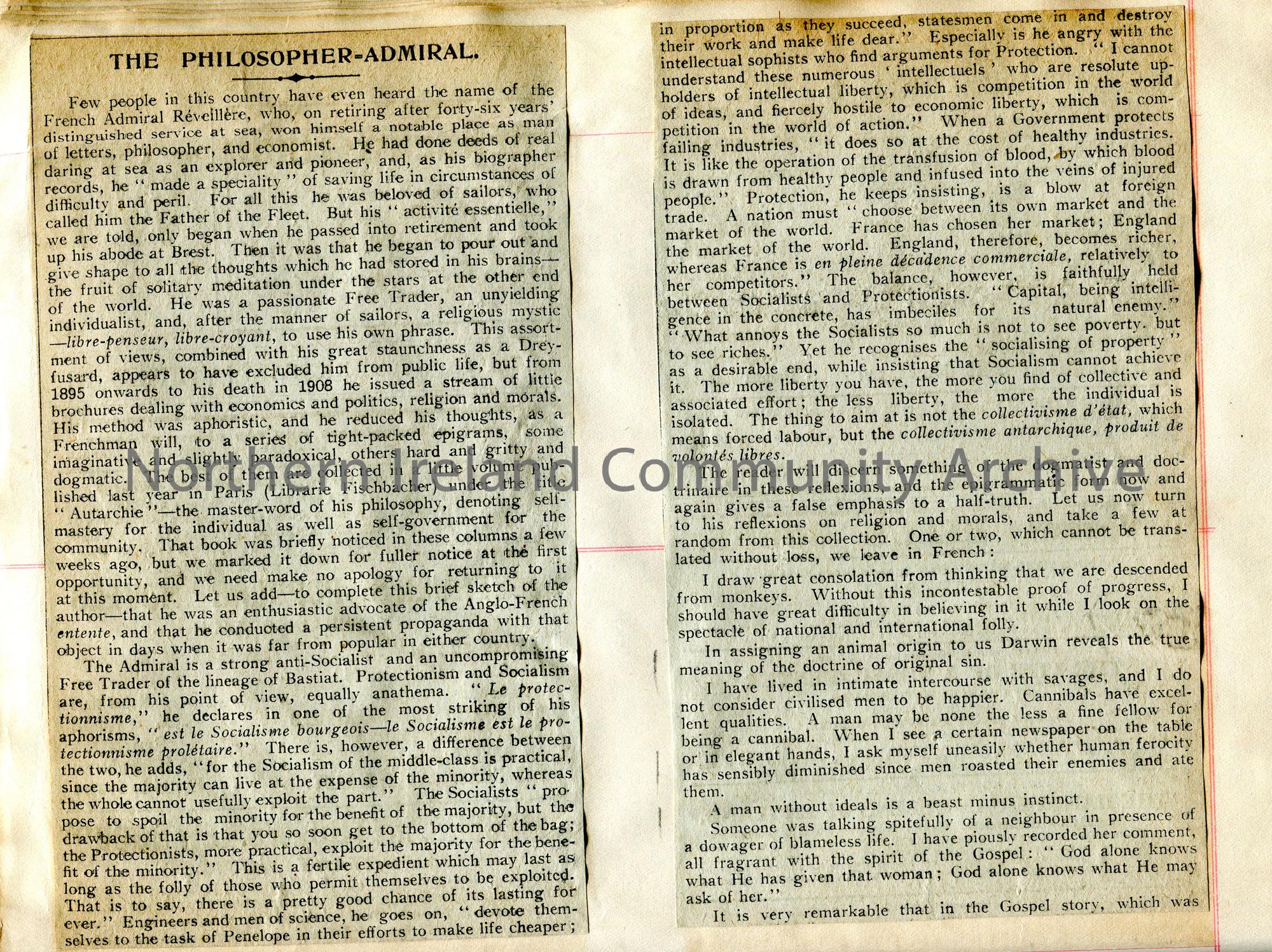Cutting of an article (4 sections) from a publication titled, ‘The Philosopher-Admiral’. Re the evolutionary beliefs of French Admiral Reveillere.