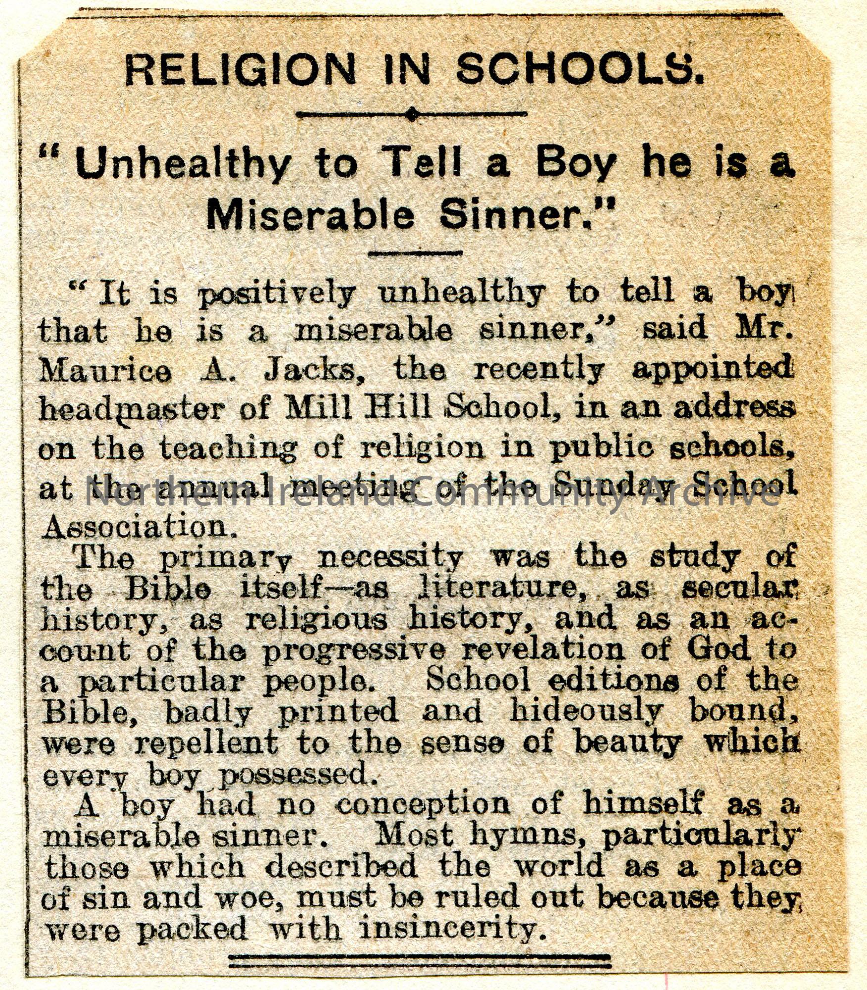 Cutting of an article from a newspaper. Titled, 'Religion In Schools. Unhealthy to Tell a Boy he is a Miserable Sinner'.