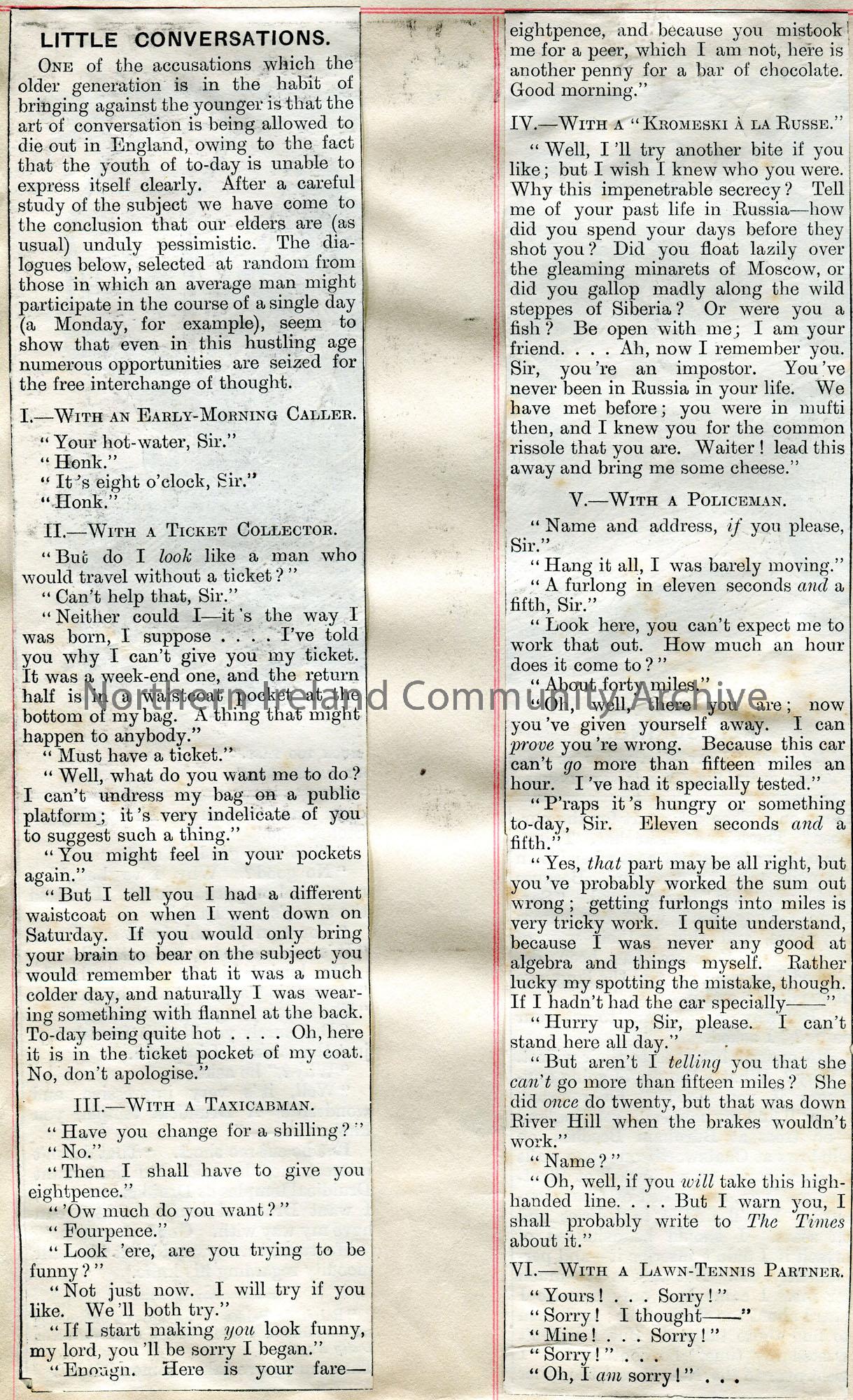 Cutting of an article from a publication. Titled, 'Little Conversations' by A.A.M. Re the dying art of conversation by youth. Tells of various conversations by a pessimistic 'older generation'.