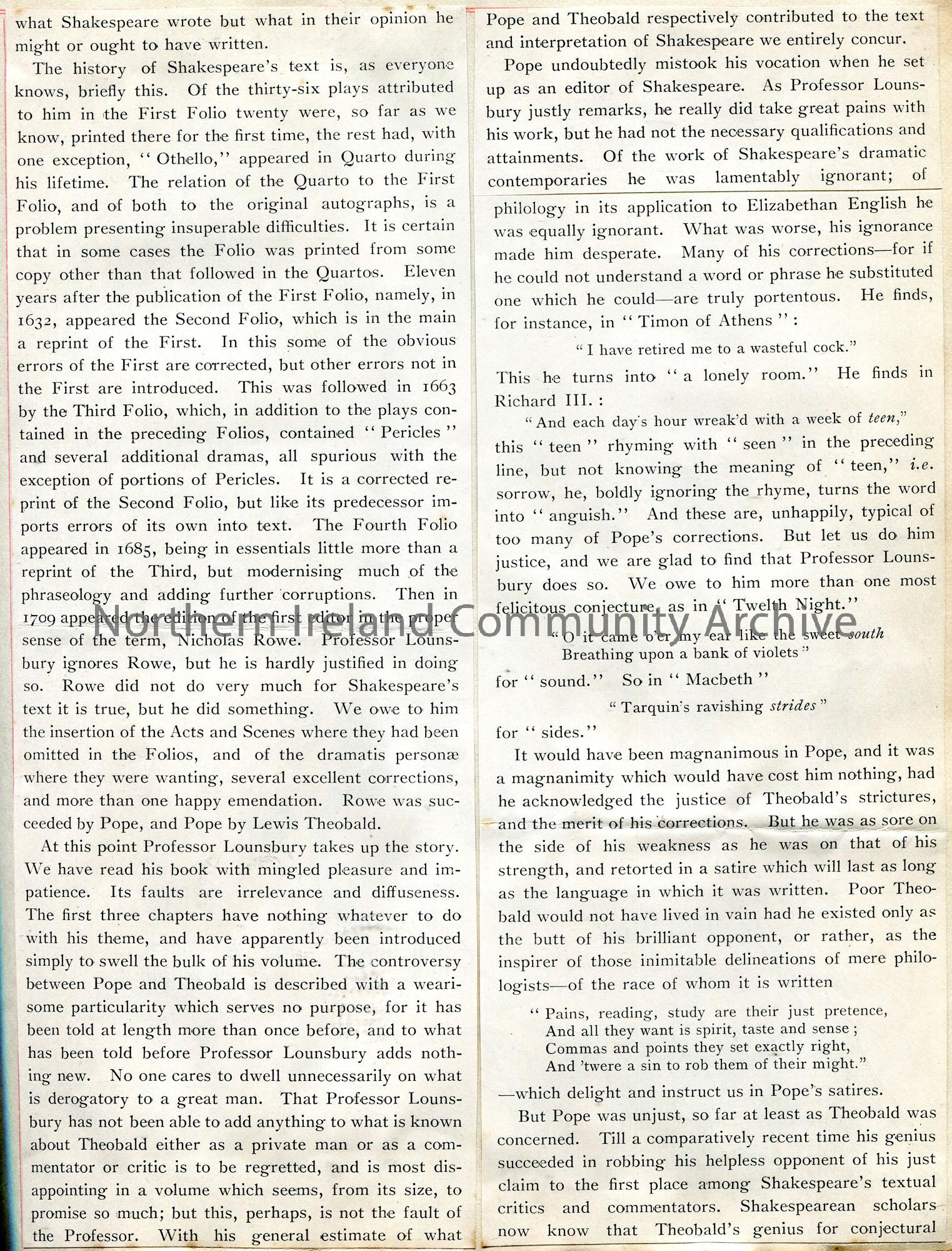 Cutting of an article stuck to paper. Titled, ‘The Text of Shakespeare. By J. Churton Collins’. – scan165b