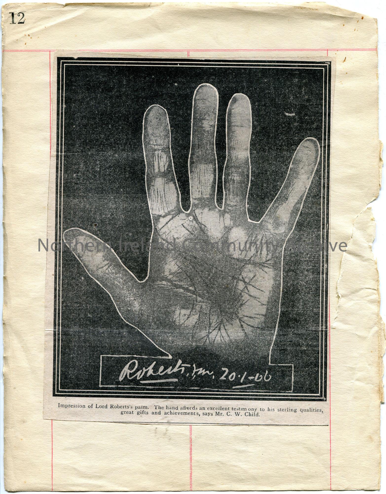 Cutting of an image from a newspaper. An impression of the palm of Lord Robert.