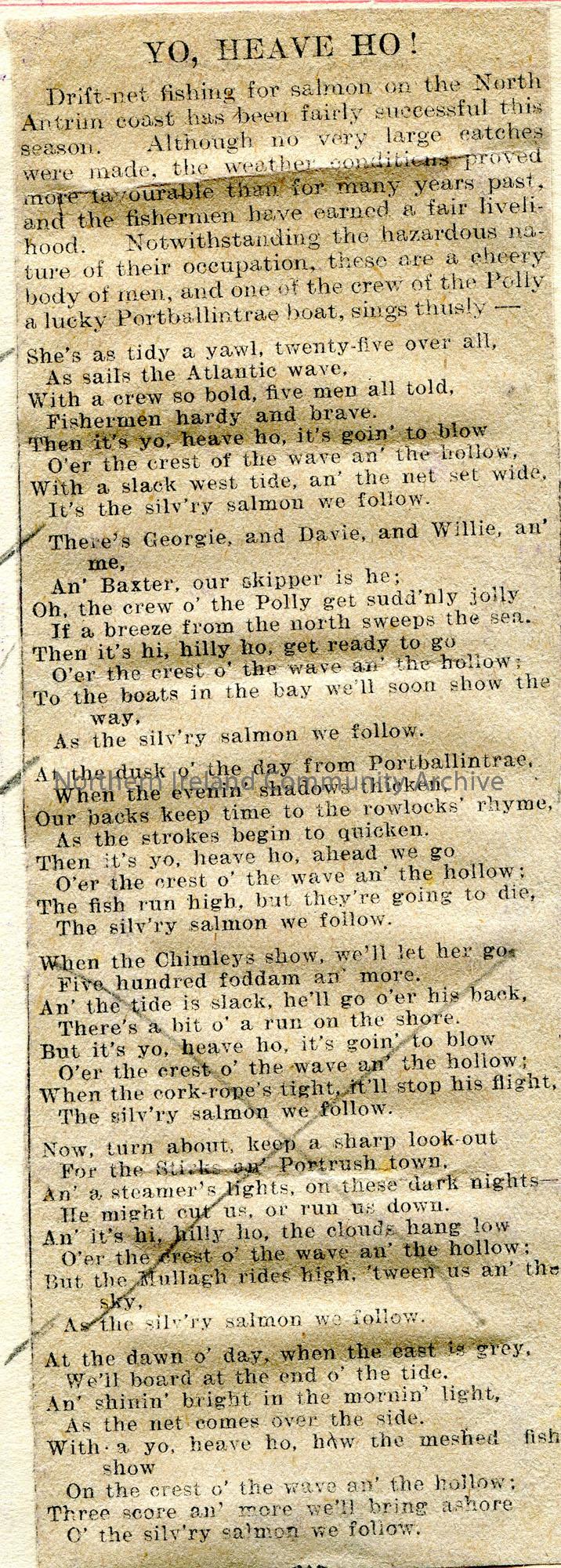 Cutting of song from a newspaper. Re salmon fishing from Portballintrae. Titled, ‘Yo, Heave, Ho!’. ‘Bob McMullan, Bushmills’ handwritten below cutting…