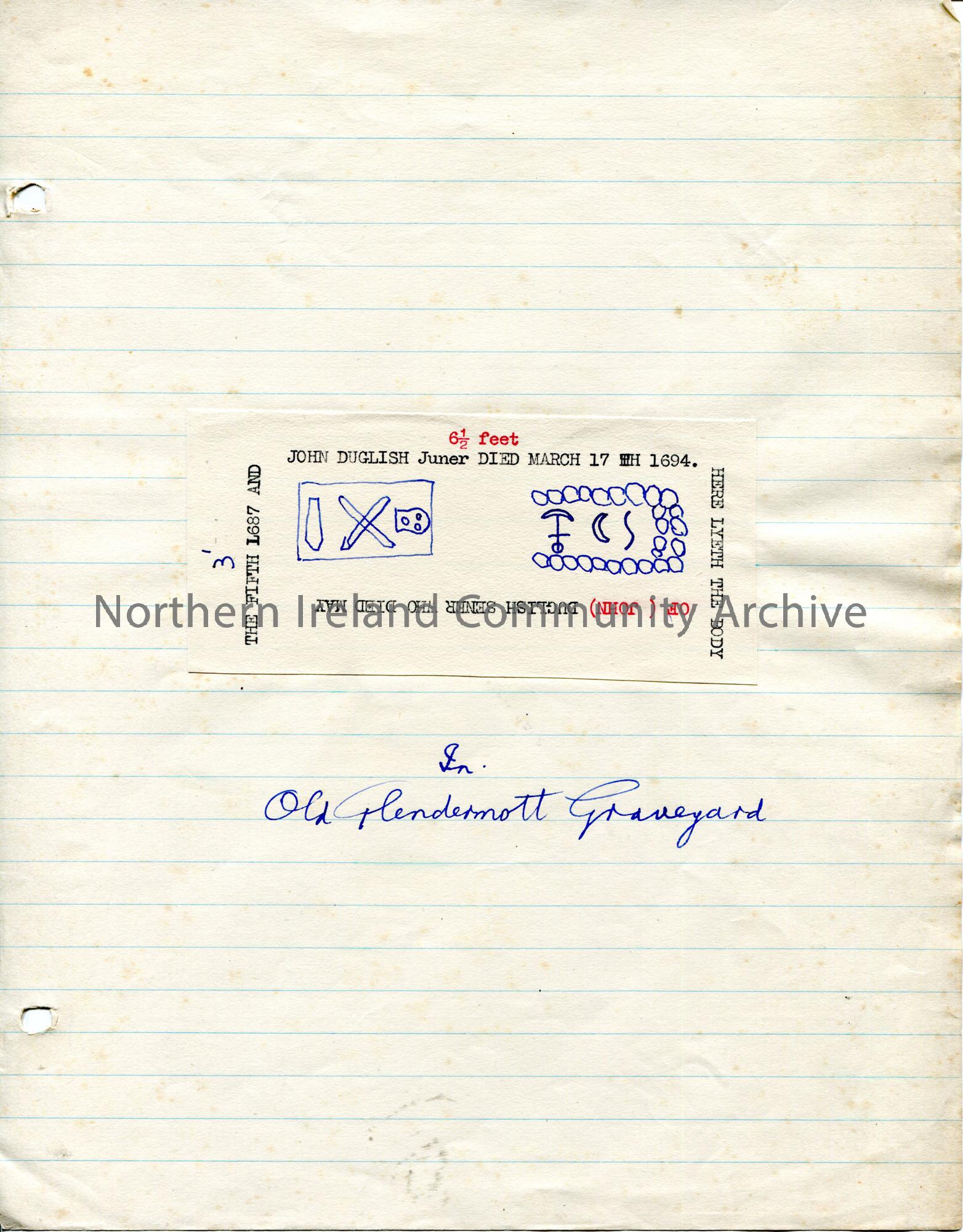 Cutting pasted to lined paper of a drawing of a grave at Old Glendermott Graveyard. Grave of John Duglish [Douglas] Sr d. 1687 and John Duglish Jr d.1…
