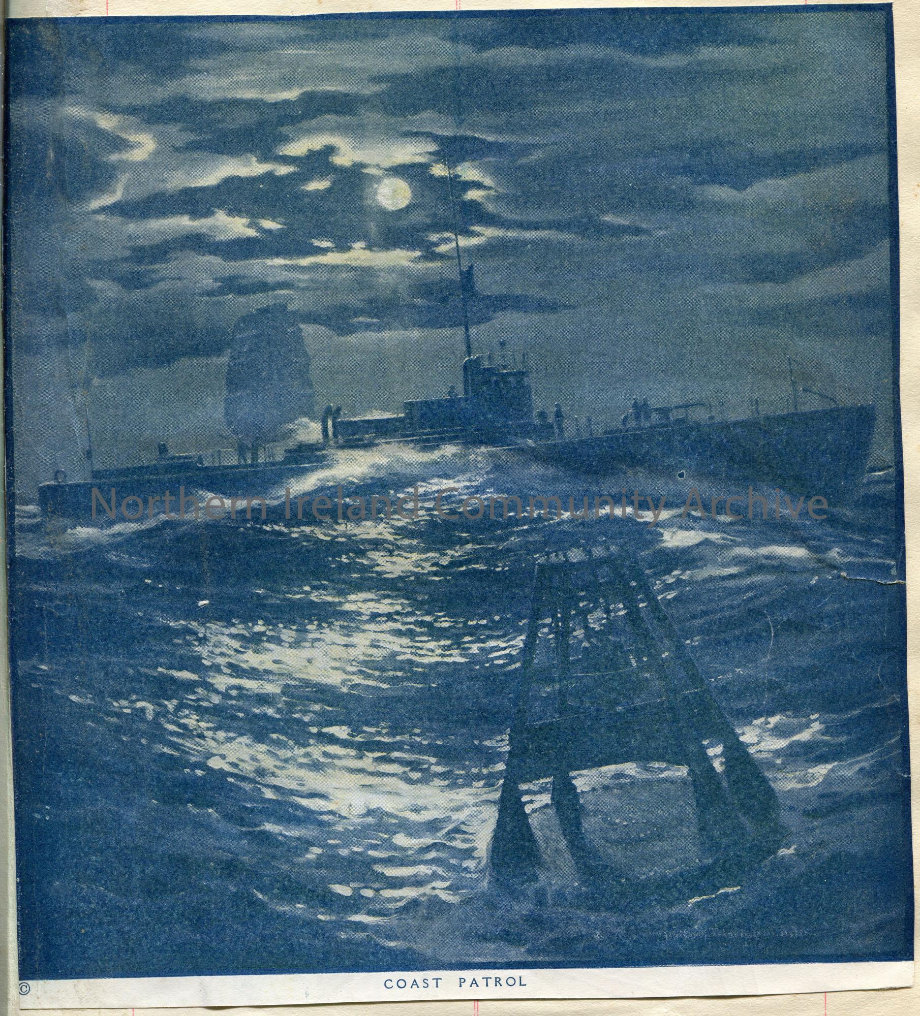 Cutting, possibly from a magazine, of what appears to be a painting of a boat in a choppy sea. Titled, ‘Coastal Patrol’.