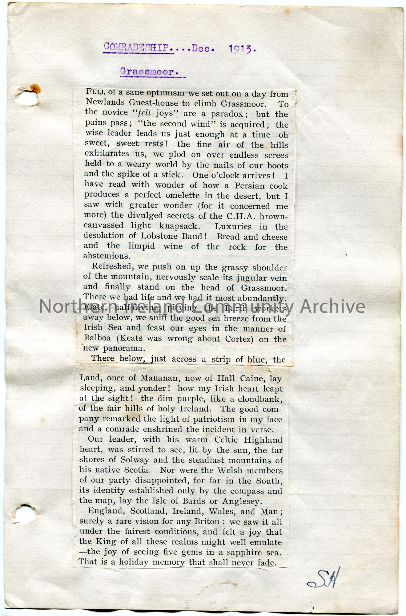 Cutting stuck to paper titled, ‘Comradeship…Dec…1913. Grassmoor’. Initialled ‘SH’. Recounts the writer’s climb, with others, of Grassmoor.