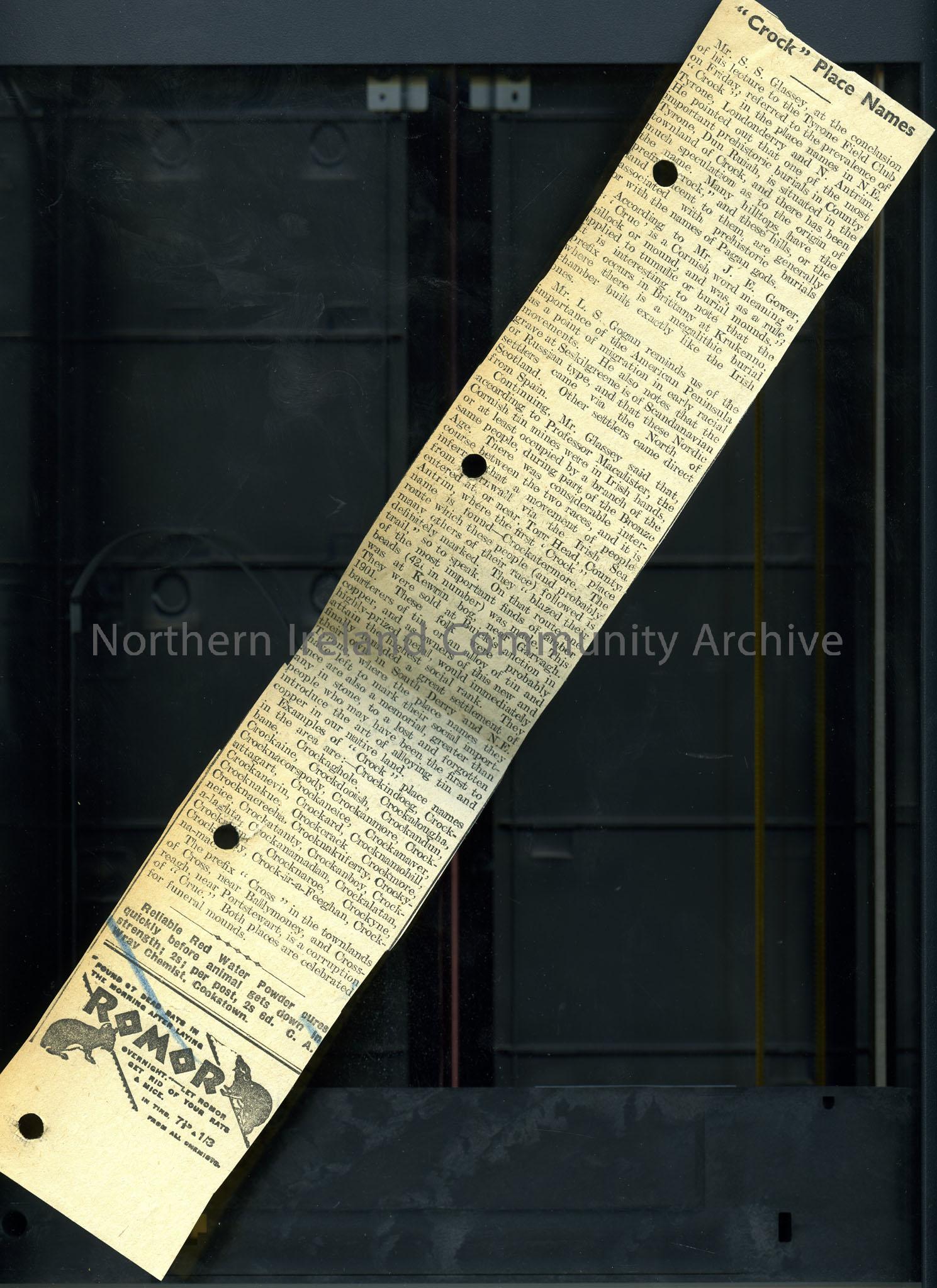 Cutting titled '"Crock" Place Names'. A report re a lecture by Mr S. S. Glassey at the Tyrone Field Club 1933 in which he discussed the origns of the term "Crock" in placenames in N.E. Tyrone, Londonderry and N.Antrim.