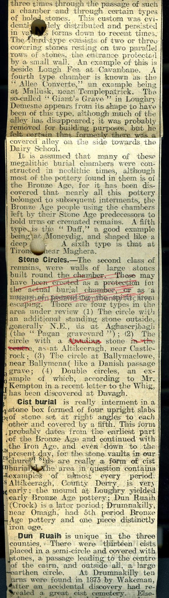 Cutting titled 'Prehistoric Burials in Derry, N.E.Tyrone and N.Antrim. Lecture by Mr S. S. Glassey, F.R.S.A.I., of Macosquin, in Cookstown to the Tyrone Naturalists Field Club re Bronze Age Civilation and Burial Chambers.