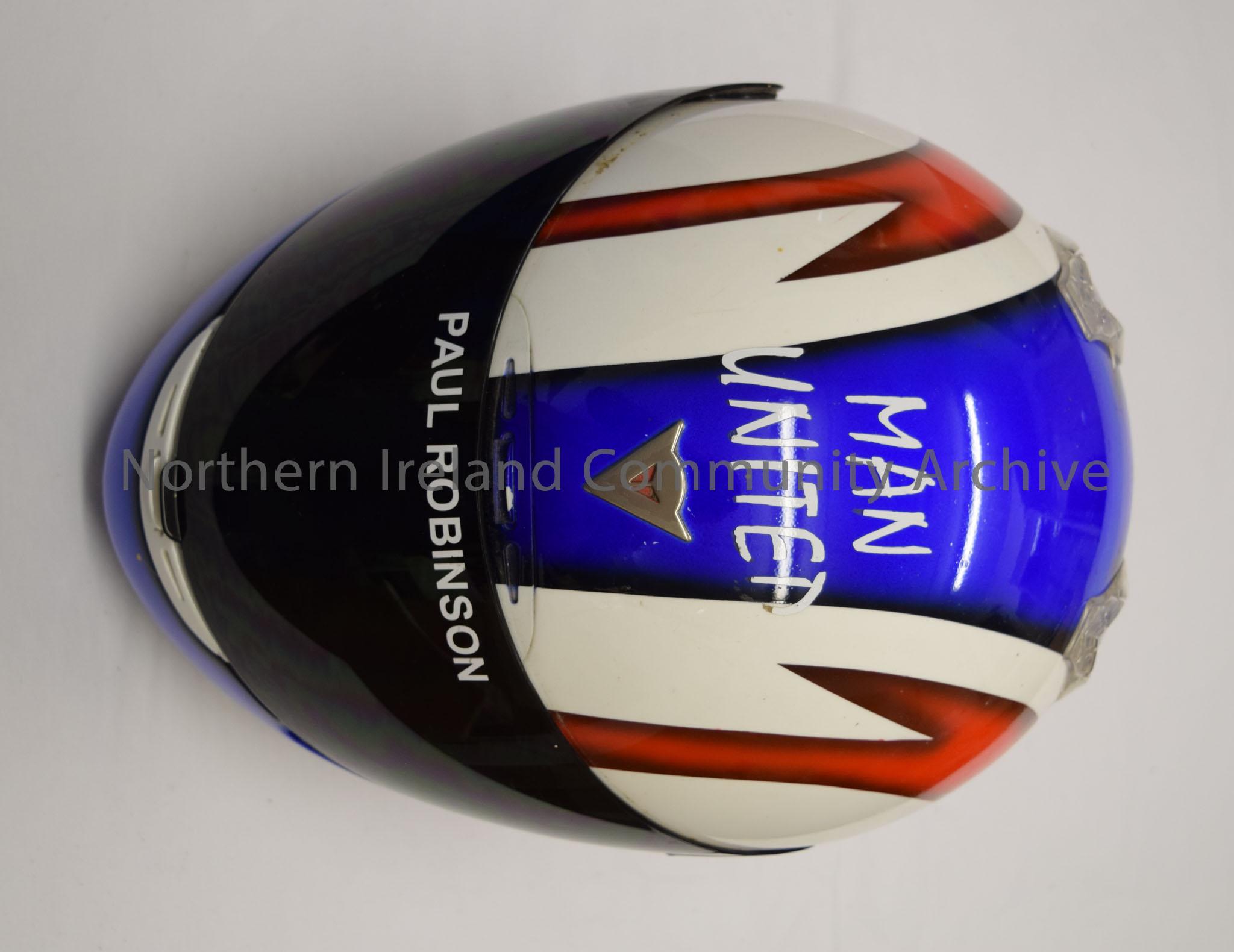 Dainese motorcycle helmet belonging to Paul Robinson. White helmet with blue stripe down the middle, blue chin bar and a red pattern on the sides. "Man Utd" written on the front.