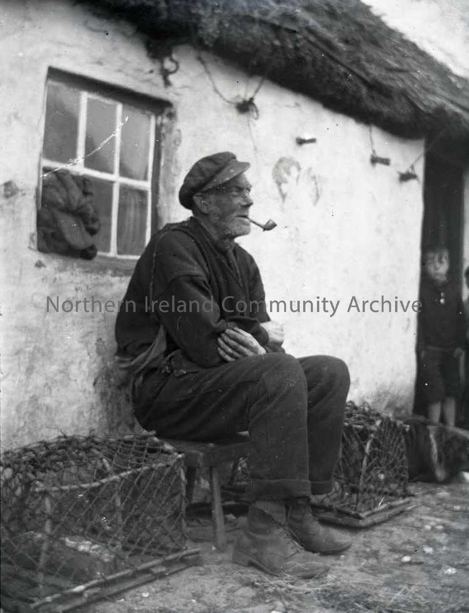 Man (Dan Brown McMullan) smoking pipe, sitting on fishing creels outside whitewashed thatched cottage. No 10 on Nature Slides inventory. Duplicate at L:2010:1.223, where he is called Dan Brown McMullan. (JM - 'Danny the Scholar', Dunseverick)
