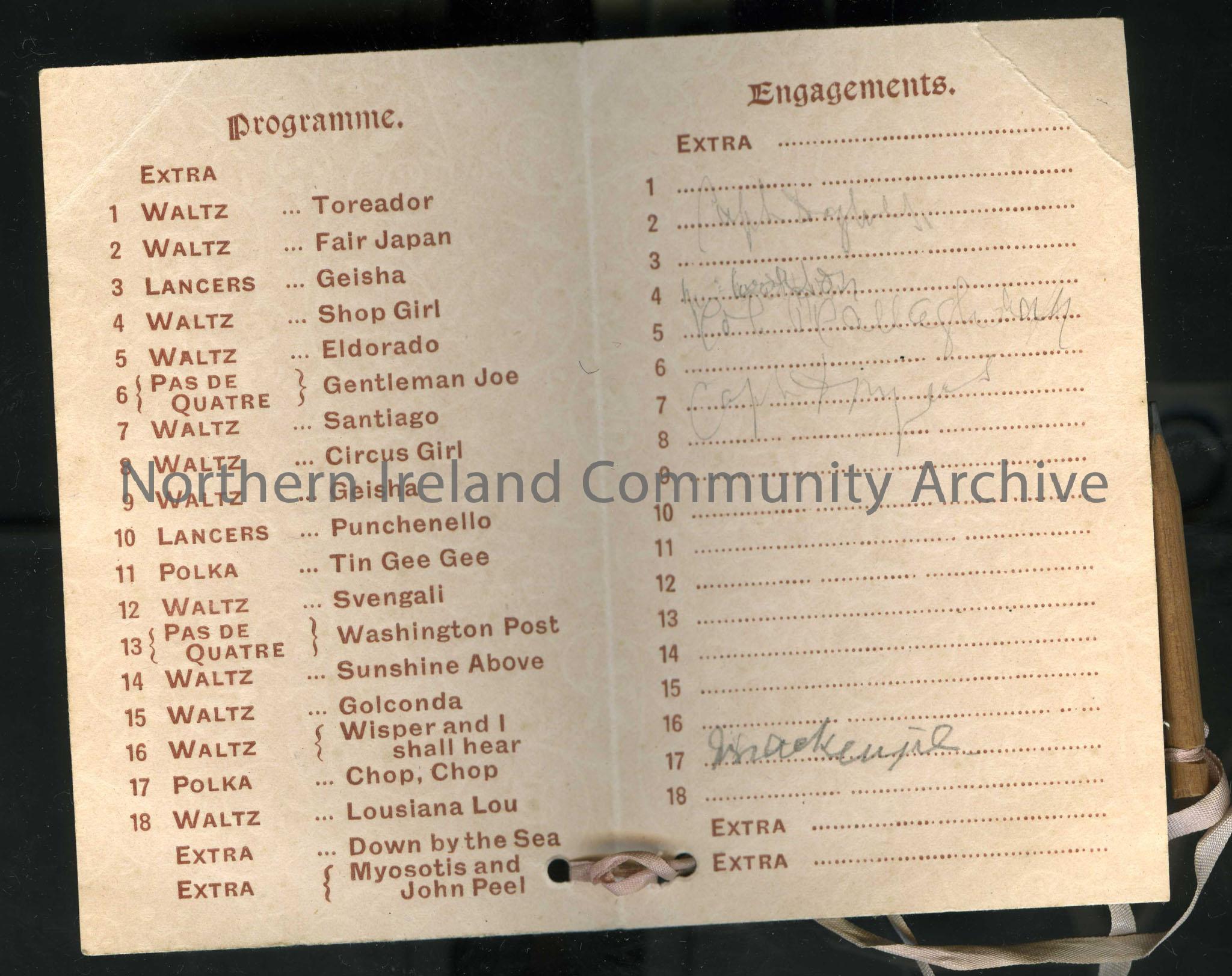 Dance card or programme. Annual Ball in aid of the Home for Convalescent Children. Dated November 12th, 1897. Names inside and pencil attached. Asse… – scan51b