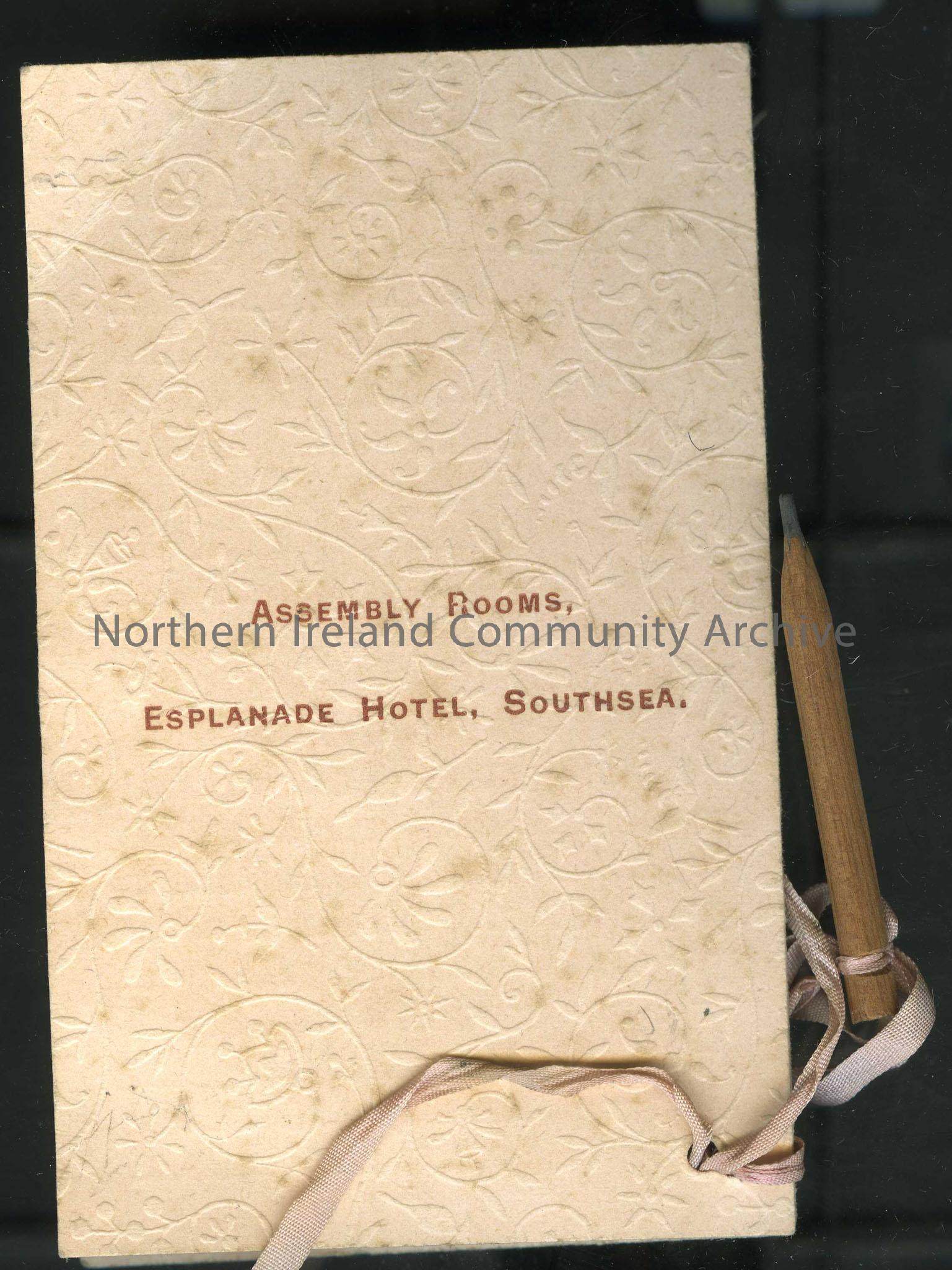 Dance card or programme. Annual Ball in aid of the Home for Convalescent Children. Dated November 12th, 1897. Names inside and pencil attached. Assembly Rooms, Esplanade Hotel, Southsea on back.