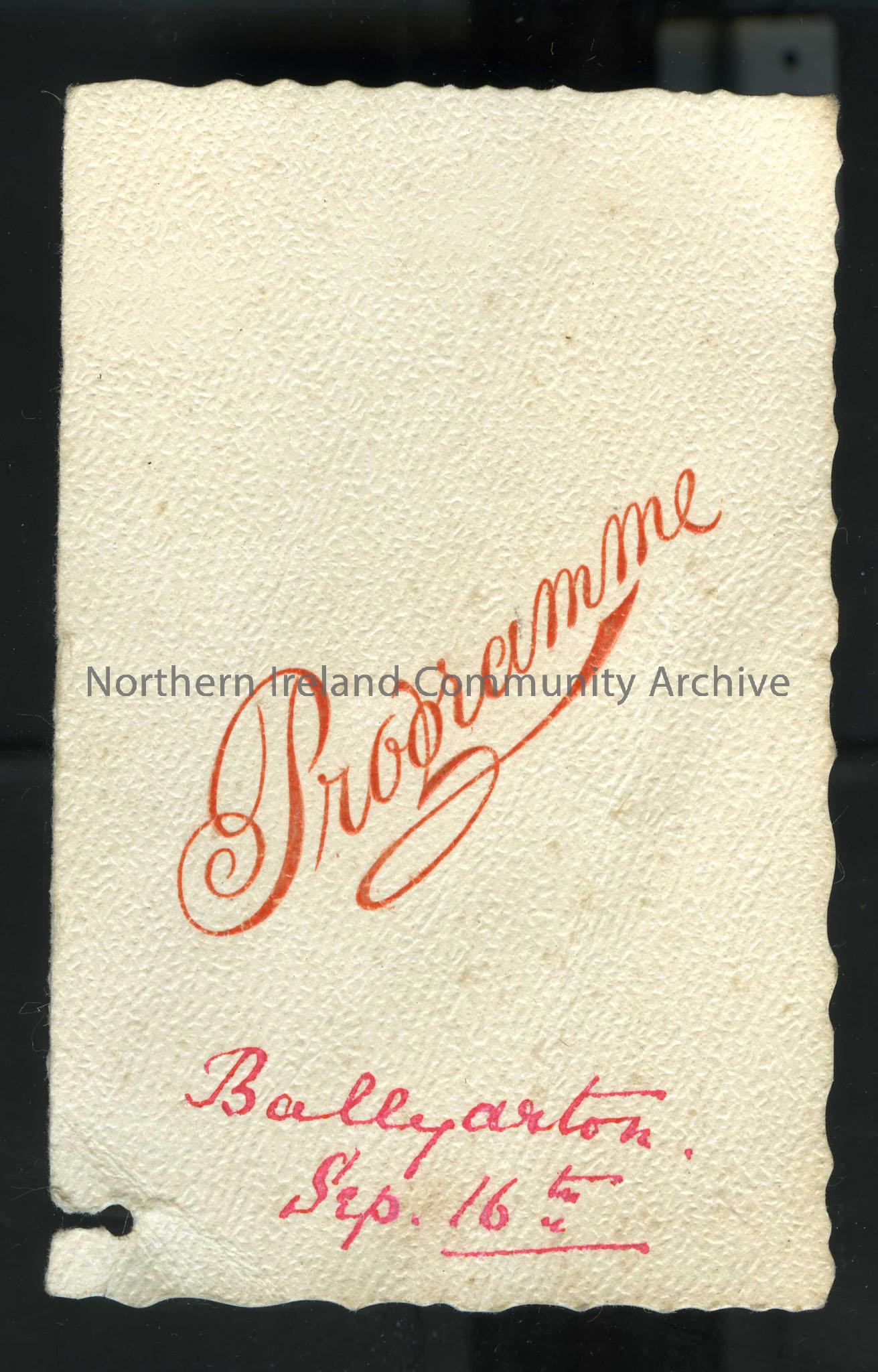 Dance card or programme. Ballyarton, Sep. 16th written on front. Names inside.