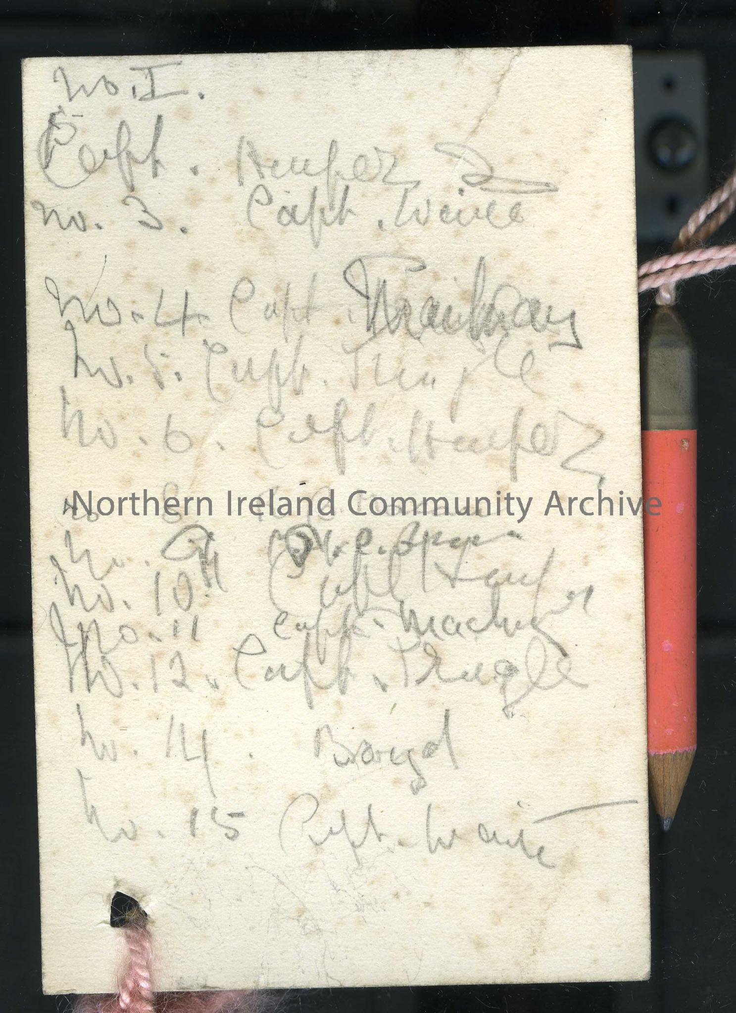 Dance card or programme. Blank card with dance numbers and names written on front and back. Undated. Pencil attached.