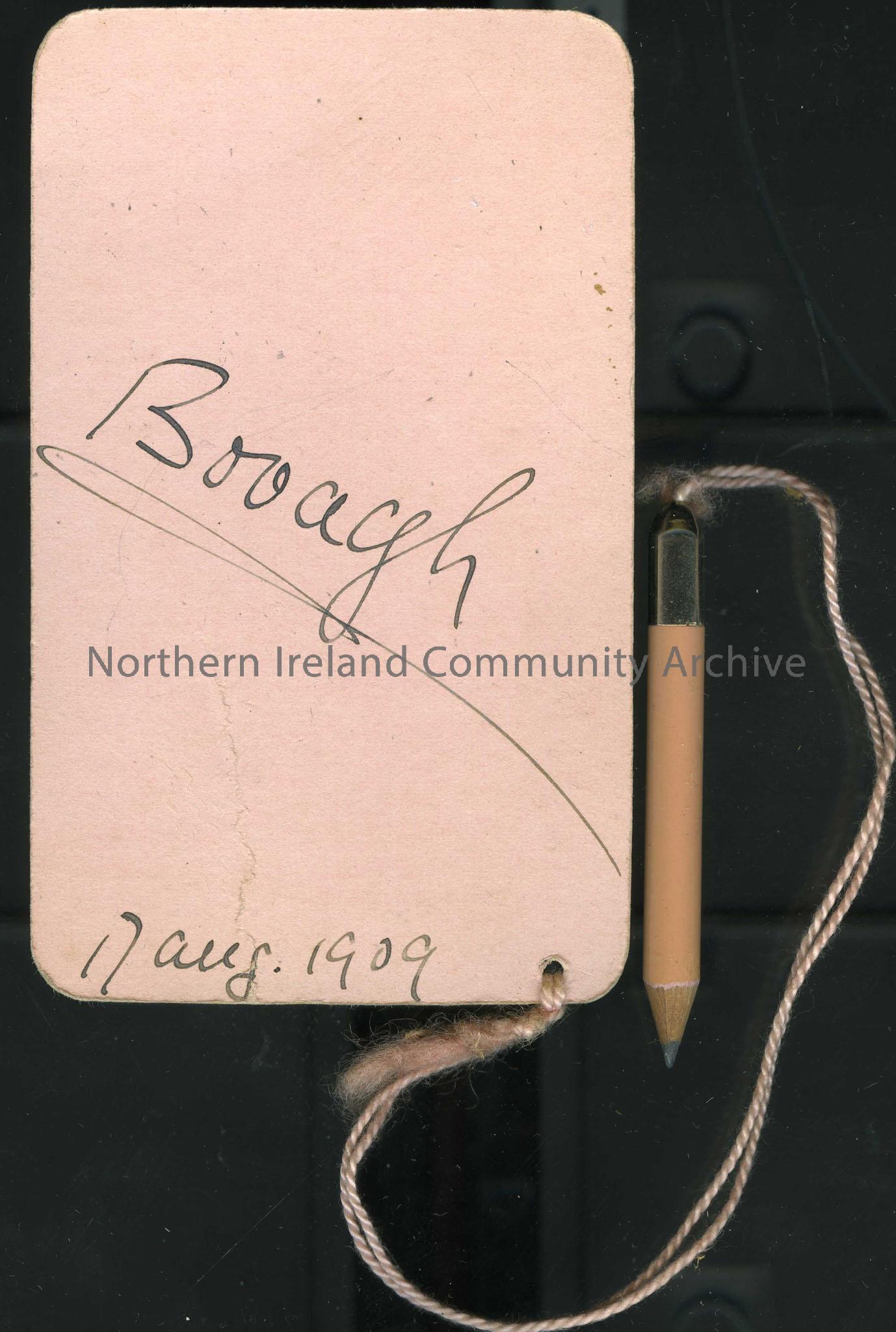 Dance card or programme. Bovagh, 17 Aug. 1909 written on front. Names on back and pencil attached.