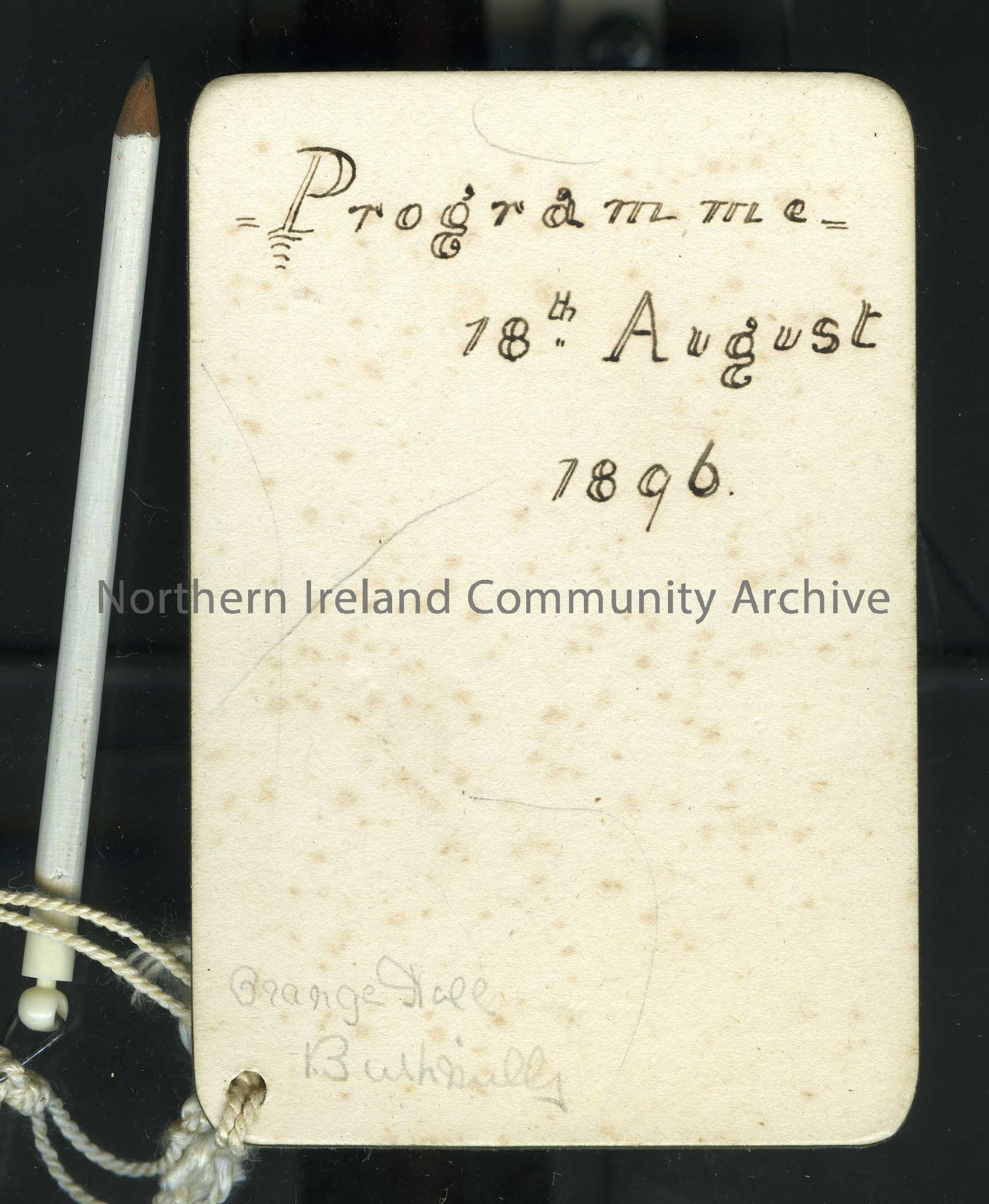 Dance card or programme. Dated 18th August, 1896. Names on back and pencil attached.