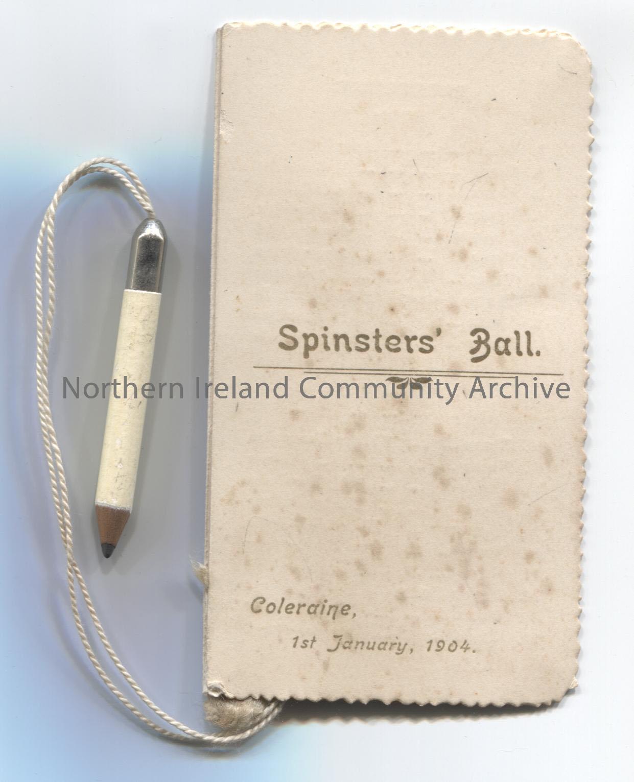 Dance card or programme for ‘Spinsters” Ball’, 1st January 1904. Pencil attached.