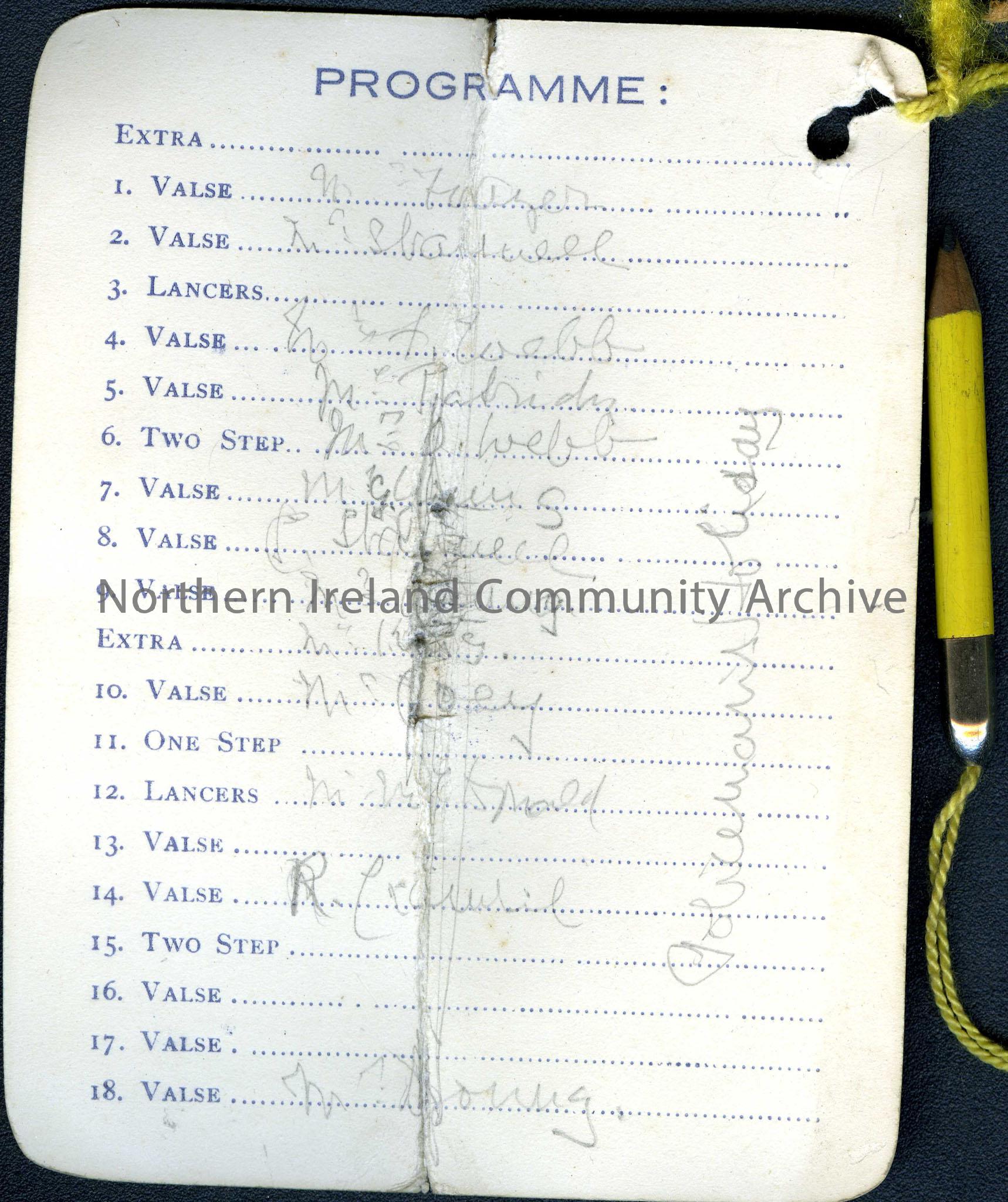 Dance card or programme. “Gledheather”. 17th January, 1913. Names on back and pencil attached. – scan027b