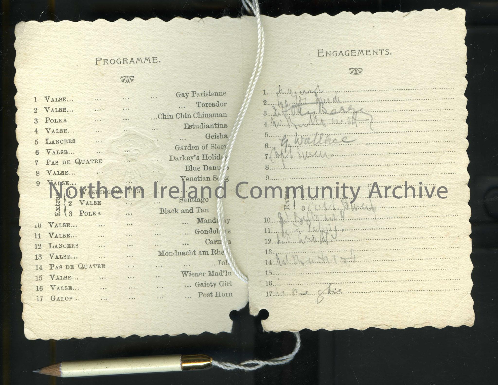 Dance card or programme. Insignia on front with crown and letter “A”. Undated. Names inside and pencil attached. – scan35b