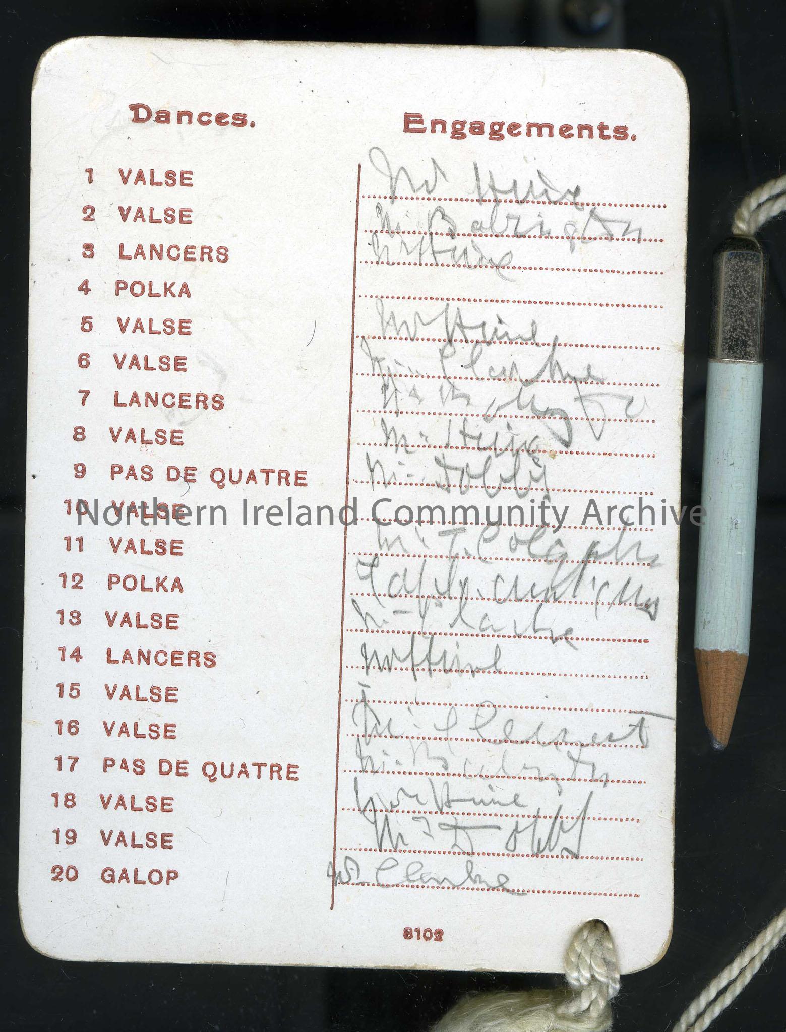 Dance card or programme. Limavady, January 9th, 1902 on front. Printed by the Sentinel, Derry. Names on back and pencil attached.