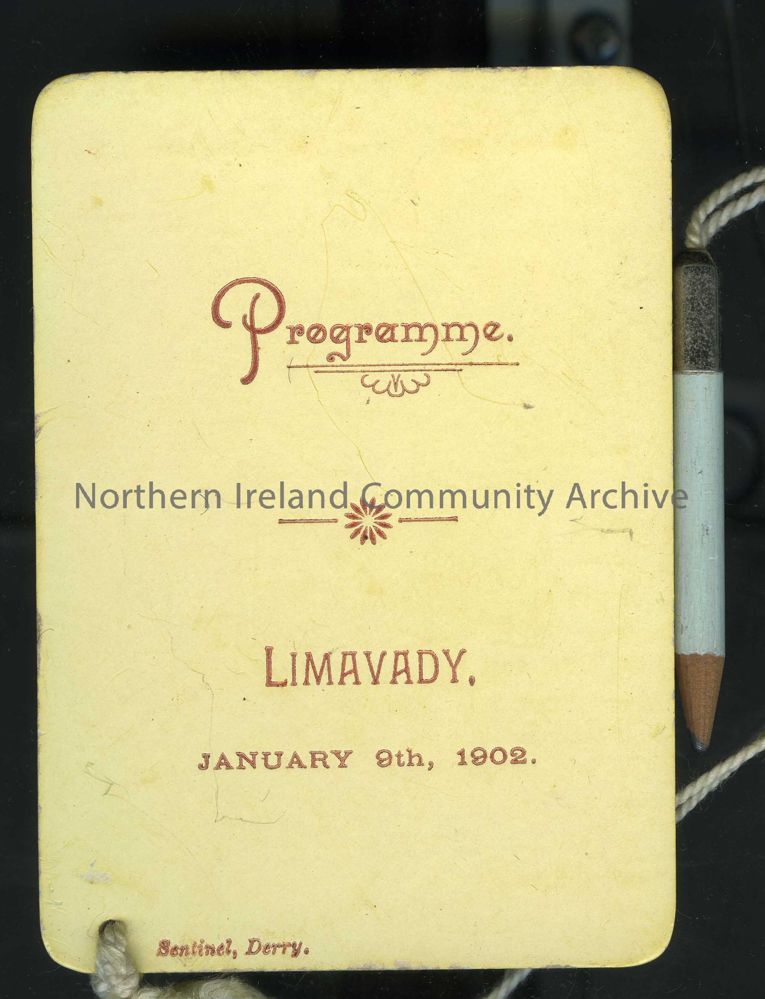 Dance card or programme. Limavady, January 9th, 1902 on front. Printed by the Sentinel, Derry. Names on back and pencil attached.