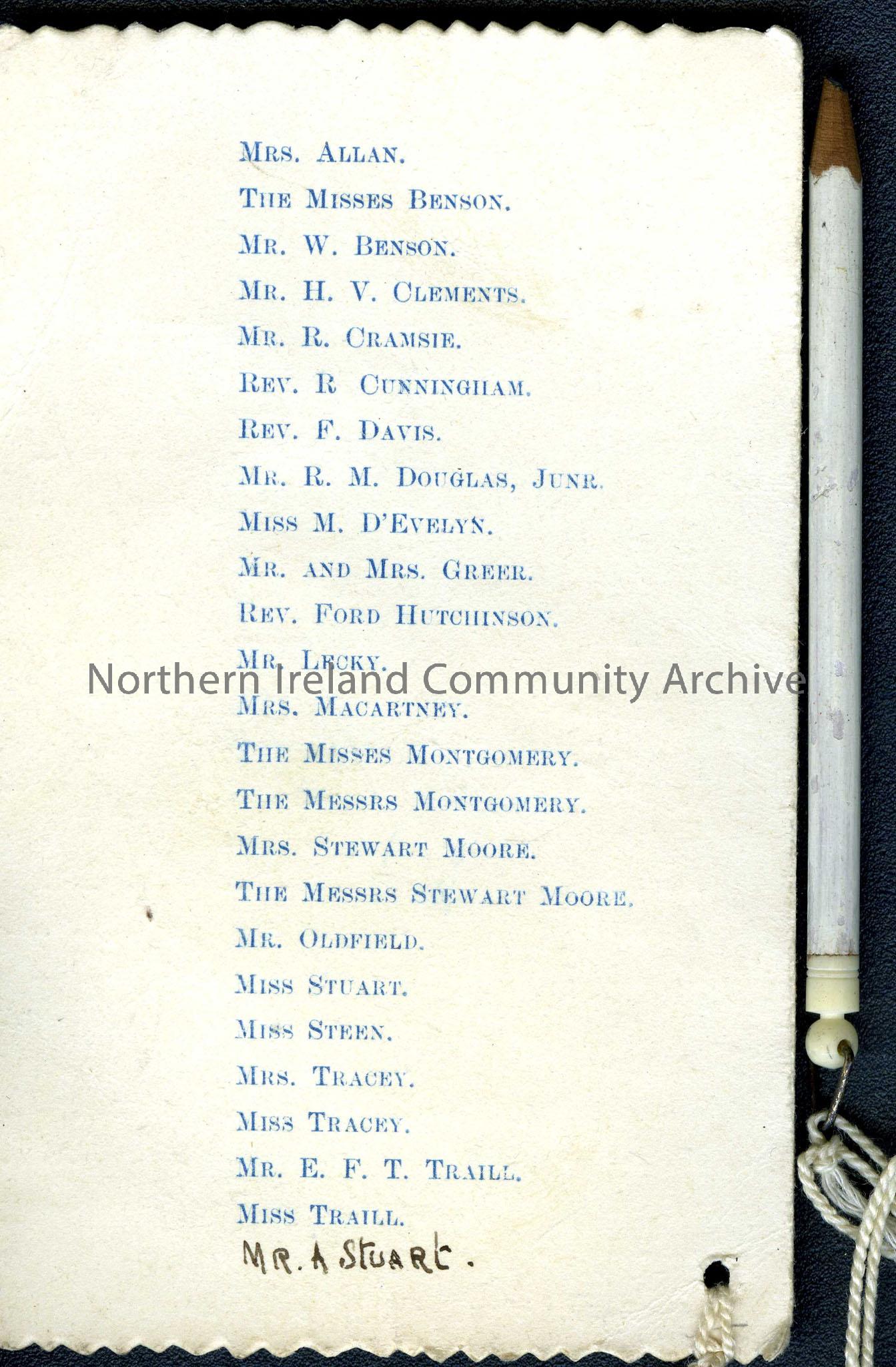 Dance card or programme. List of names on one side and Dances and Engagements listed on the other side. Pencil attached.
