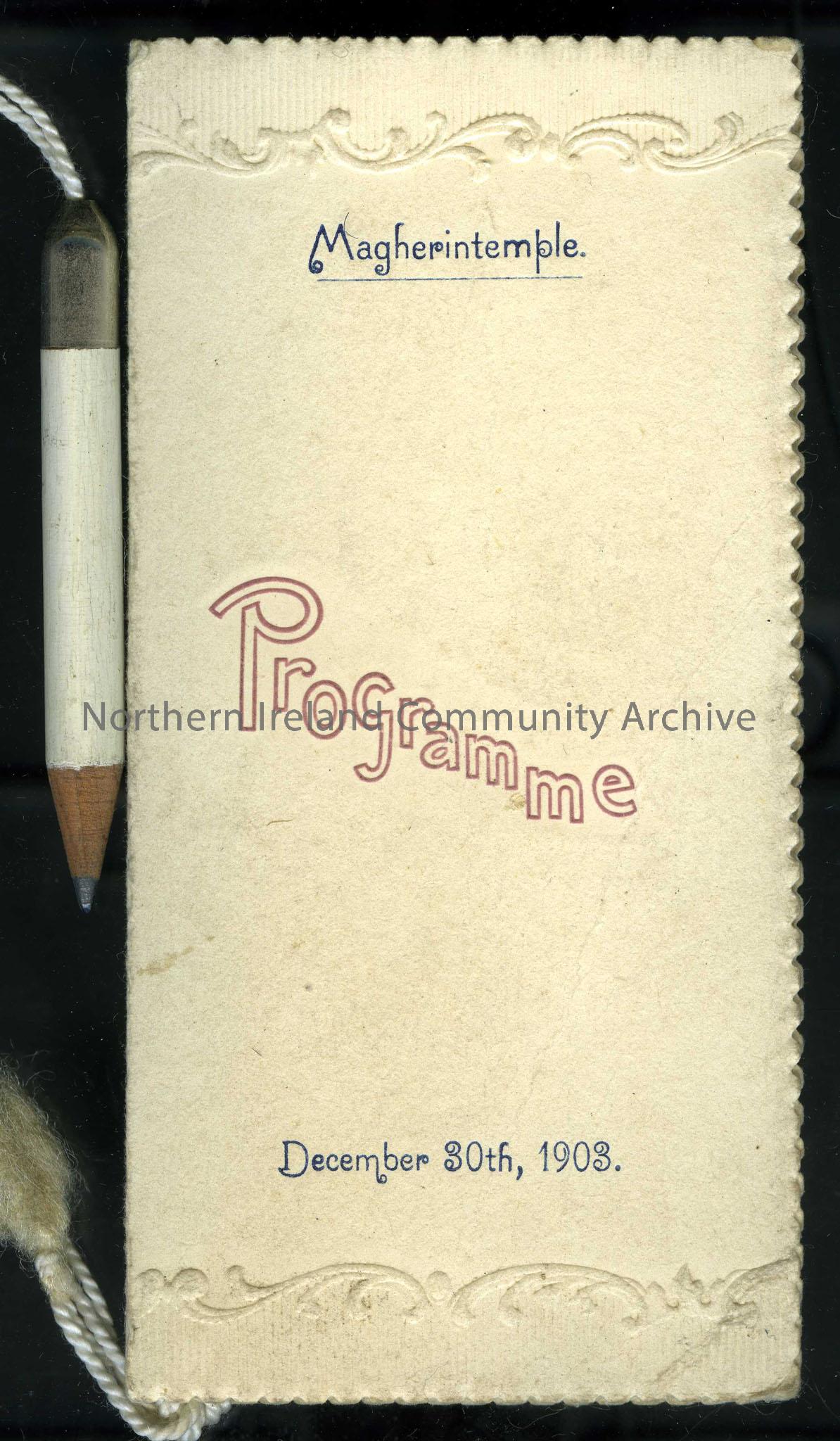 Dance card or programme. Magherintemple, December 30th, 1908. Names inside and pencil attached.