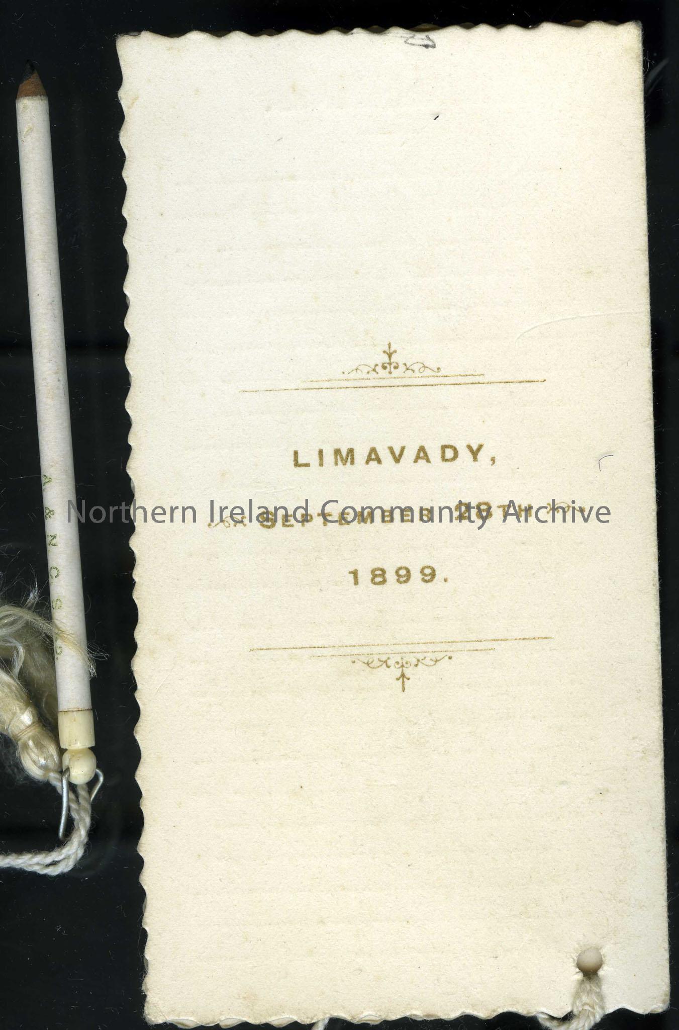 Dance card or programme. Names inside and pencil attached. Limavady, September 25th, 1899 on back.