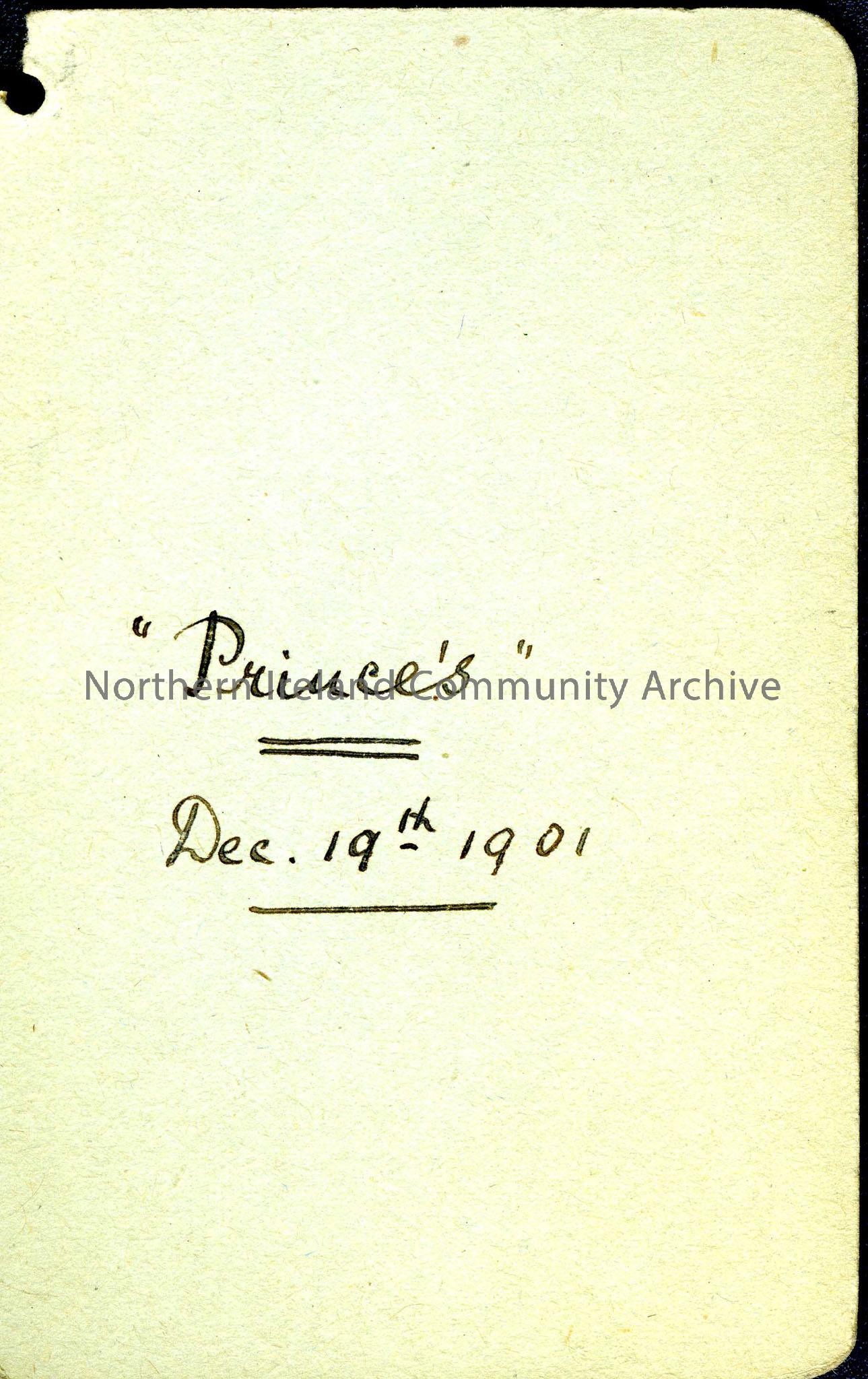 Dance card or programme. “Prince’s” 19th December 1901.
