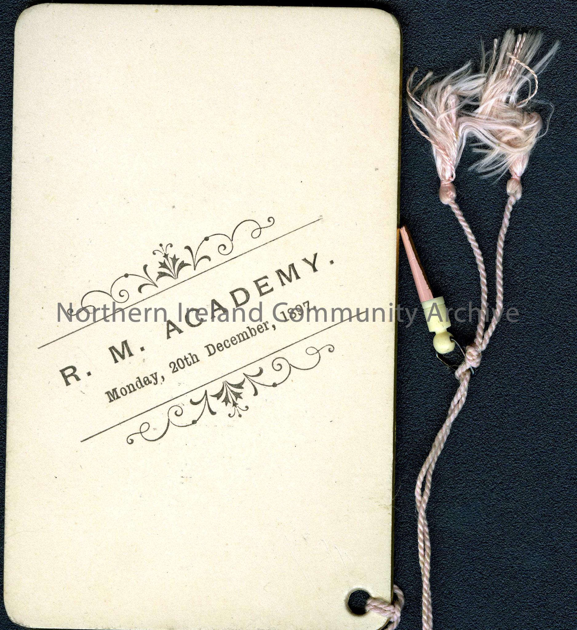 Dance card or programme. R. M. Academy, Monday 20th December 1897. Part of pencil still attached.