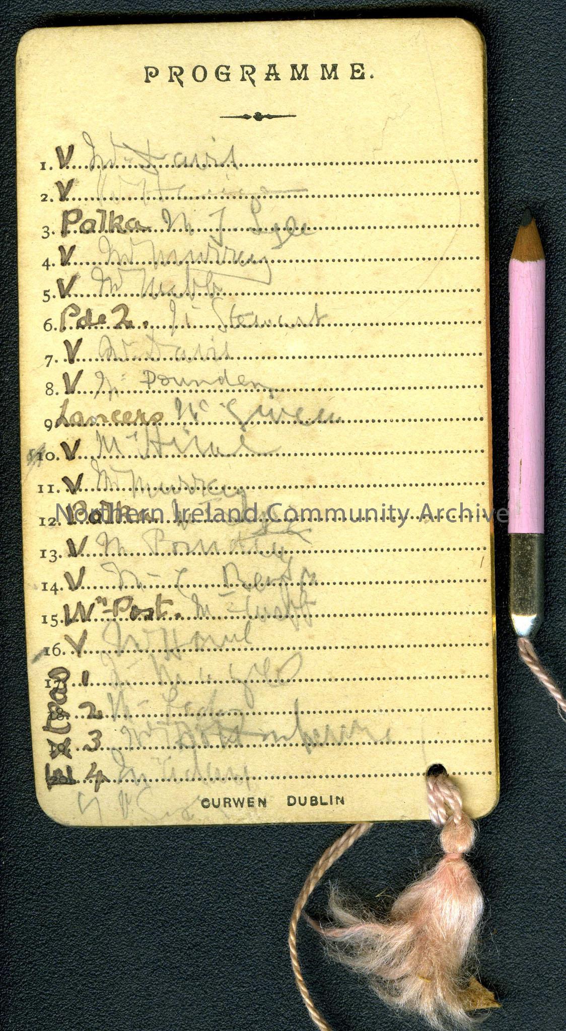 Dance card or programme. Ratheen? August 31st 1898. Pencil attached.