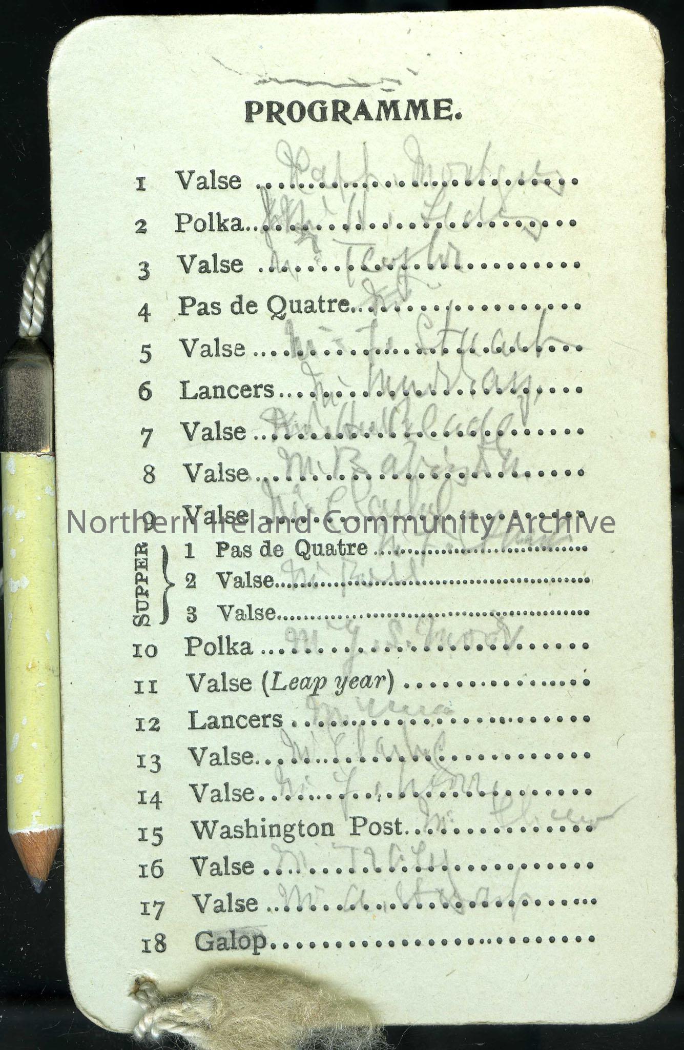 Dance card or programme. Town Hall, Portrush, April 5th. Names on back and pencil attached. – scan56b