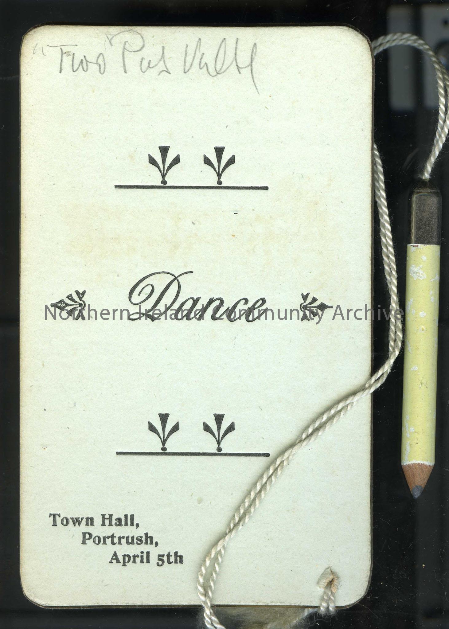 Dance card or programme. Town Hall, Portrush, April 5th. Names on back and pencil attached.