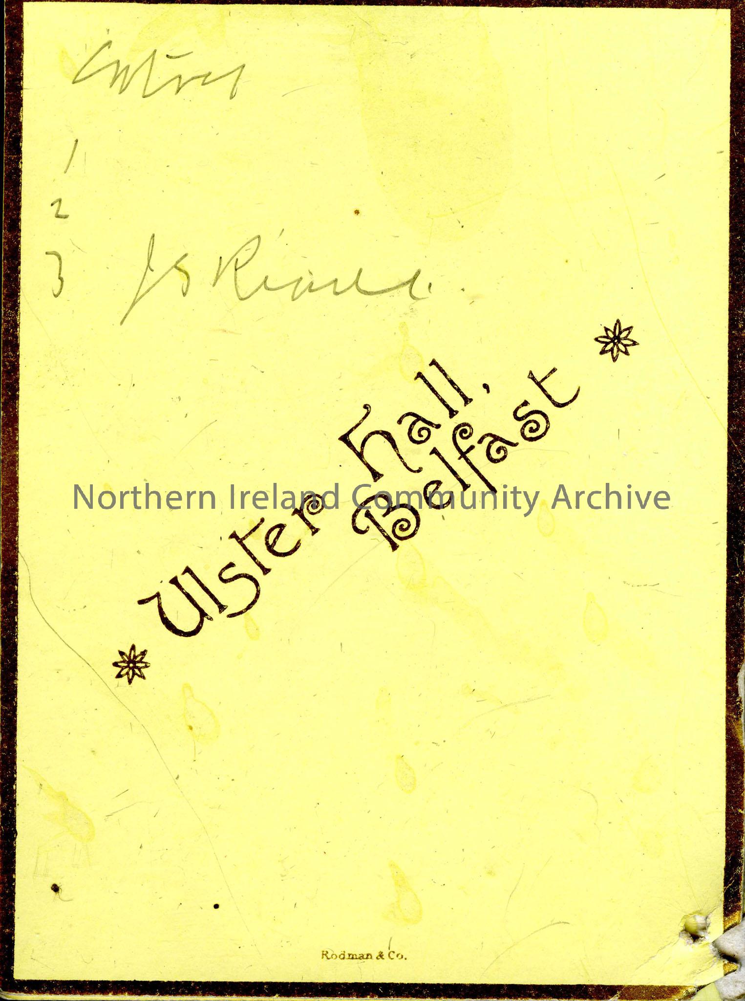 Dance card or programme. Ulster Club Ball, 20th November, 1896. Names on inside. “Ulster Hall, Belfast” on back. – scan029c