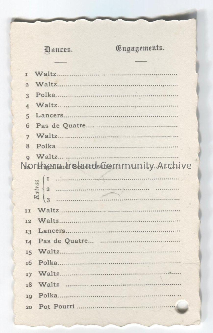 Dance card – Programme, Portrush, 21st Dec 1900. 20 dances listed on reverse. – 009.b