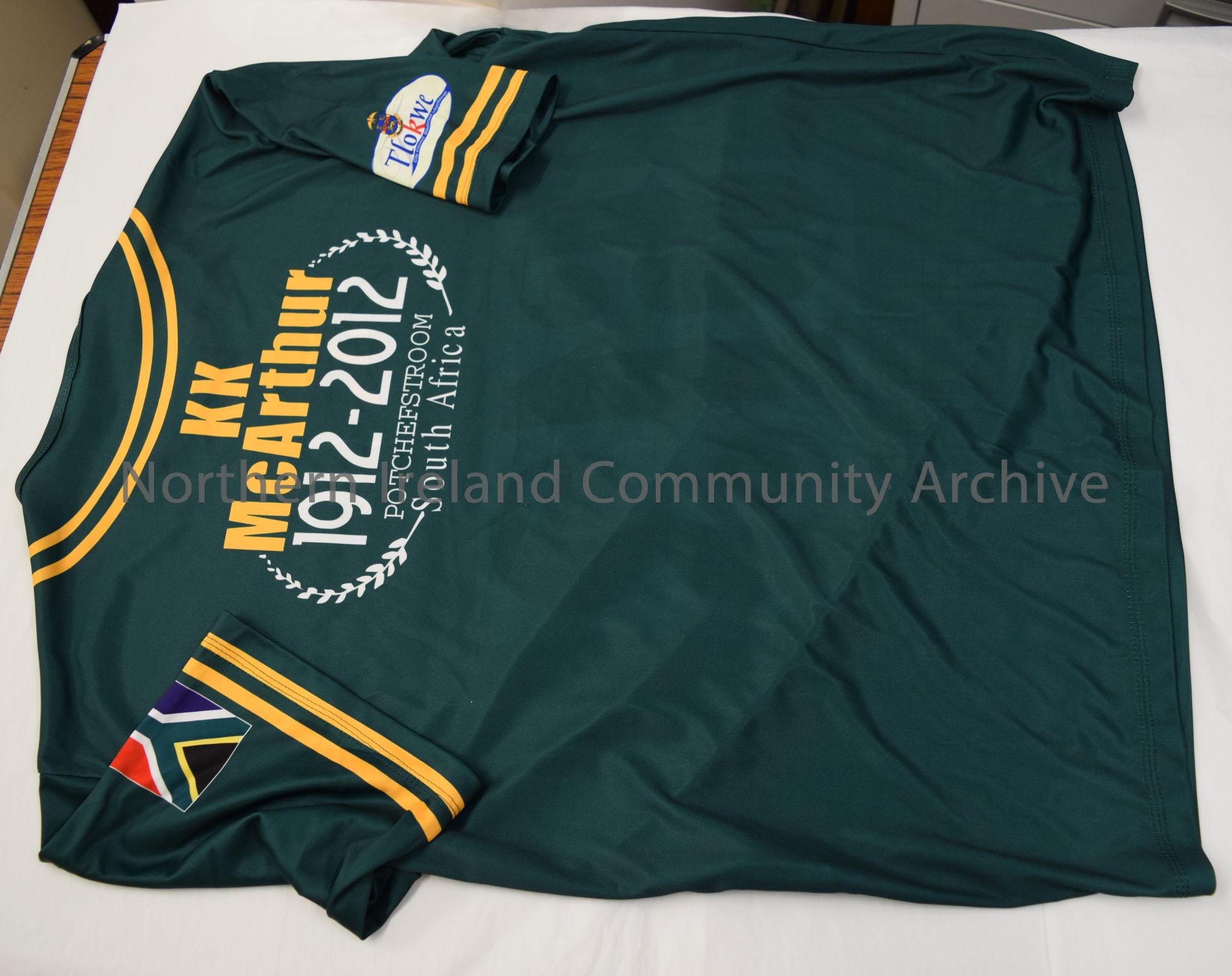 Dark green t-shirt with yellow stripes on the sleeves, number 613 on the front, and a K.K McArthur logo on the back. South Africa flag on the left sle…