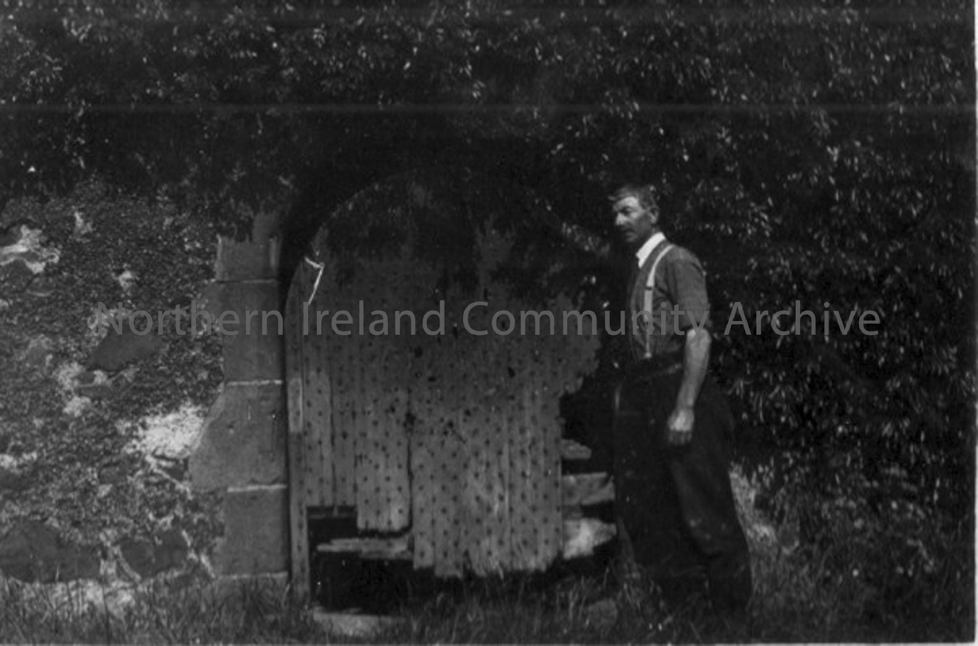 Davey McBride, caretaker of old church tower, Ballymoney. Davey was also the caretaker of the new cemetery on Market Street and lives in the house on right entering the cemetery.
