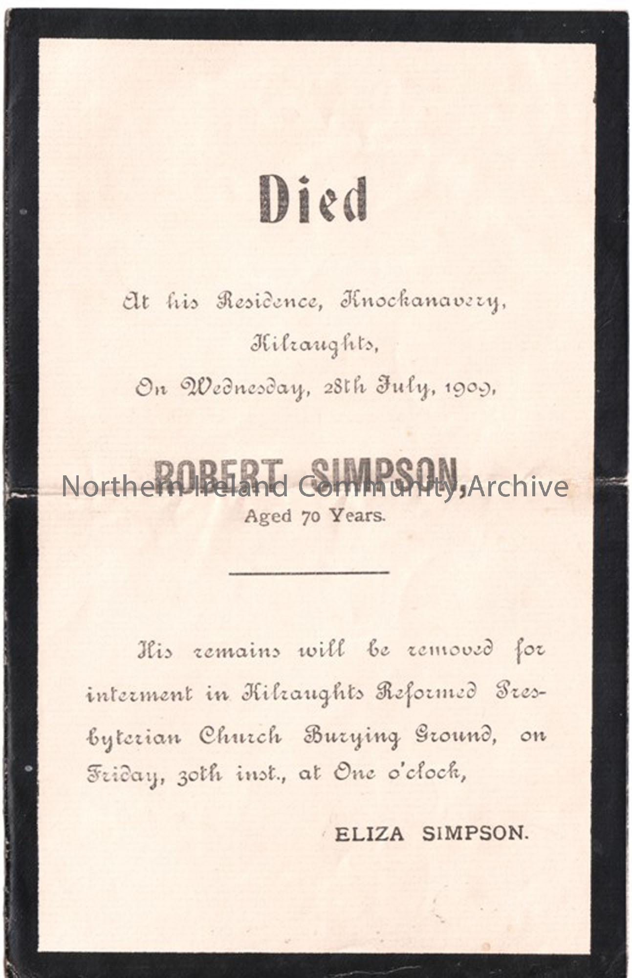 Death notice of Mr Robert Simpson, of Knockanavery, d. 28th July 1909, aged 70 years