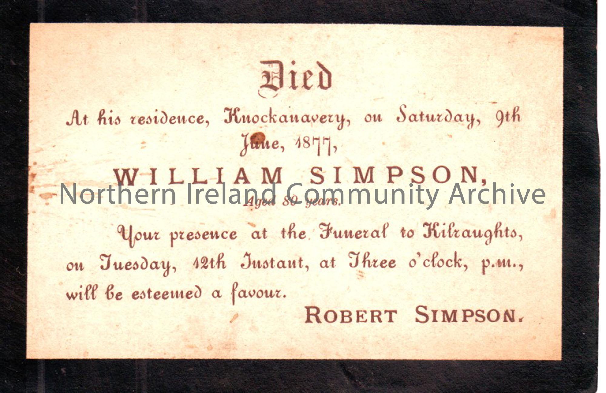 Death notice of William Simpson, of Knockanavery, d. 9.6.1877, aged 80 years