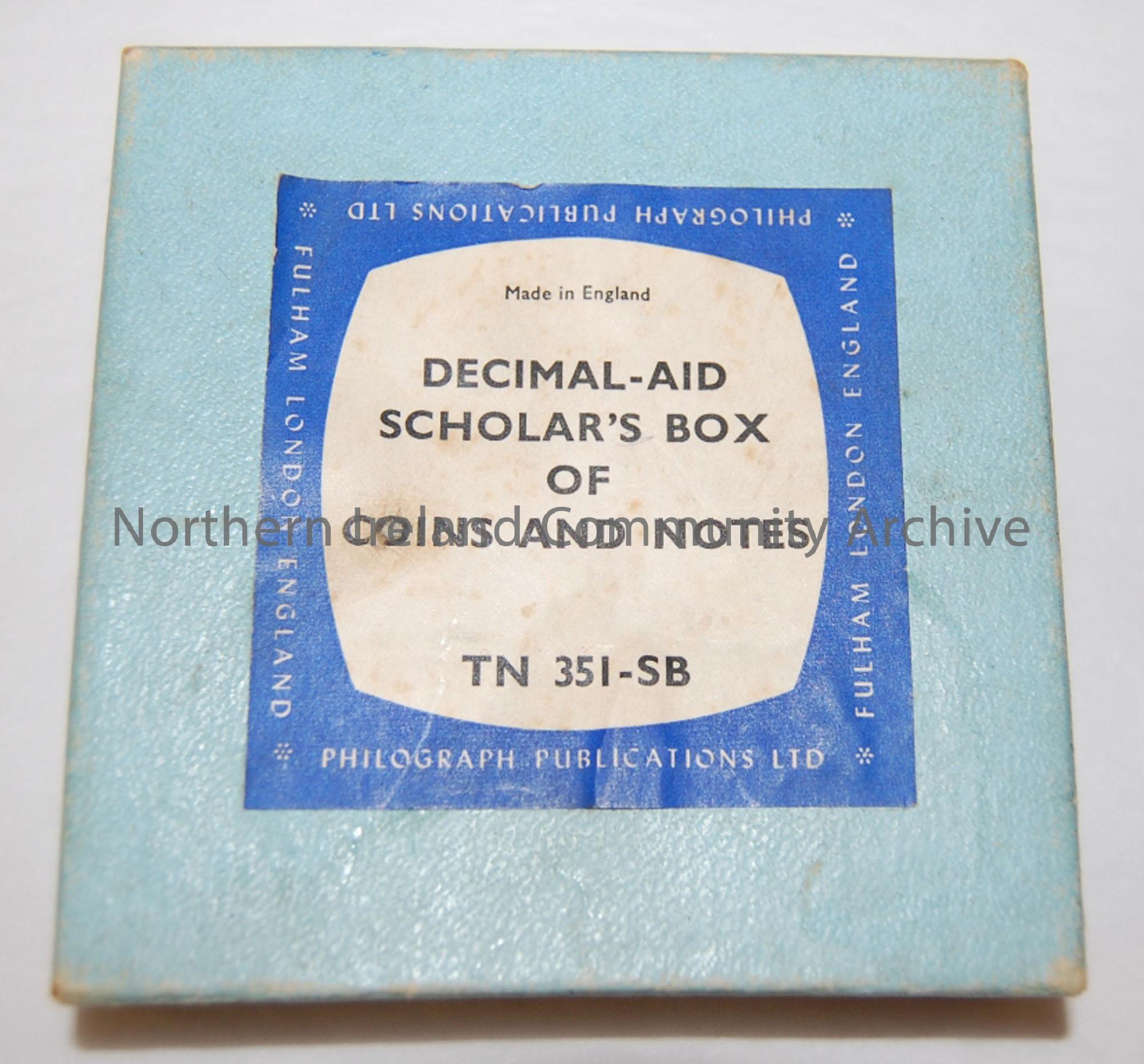 'Decimal-aid/scholar's box/of/coins and notes..' Made in England by Philograph Publications. Cardboard coins; 25 x 5p (gray), 5 x 10p (gray), 18 x 2p (brown), 21 x 1p (brown), c.1971. Contained in a blue box.