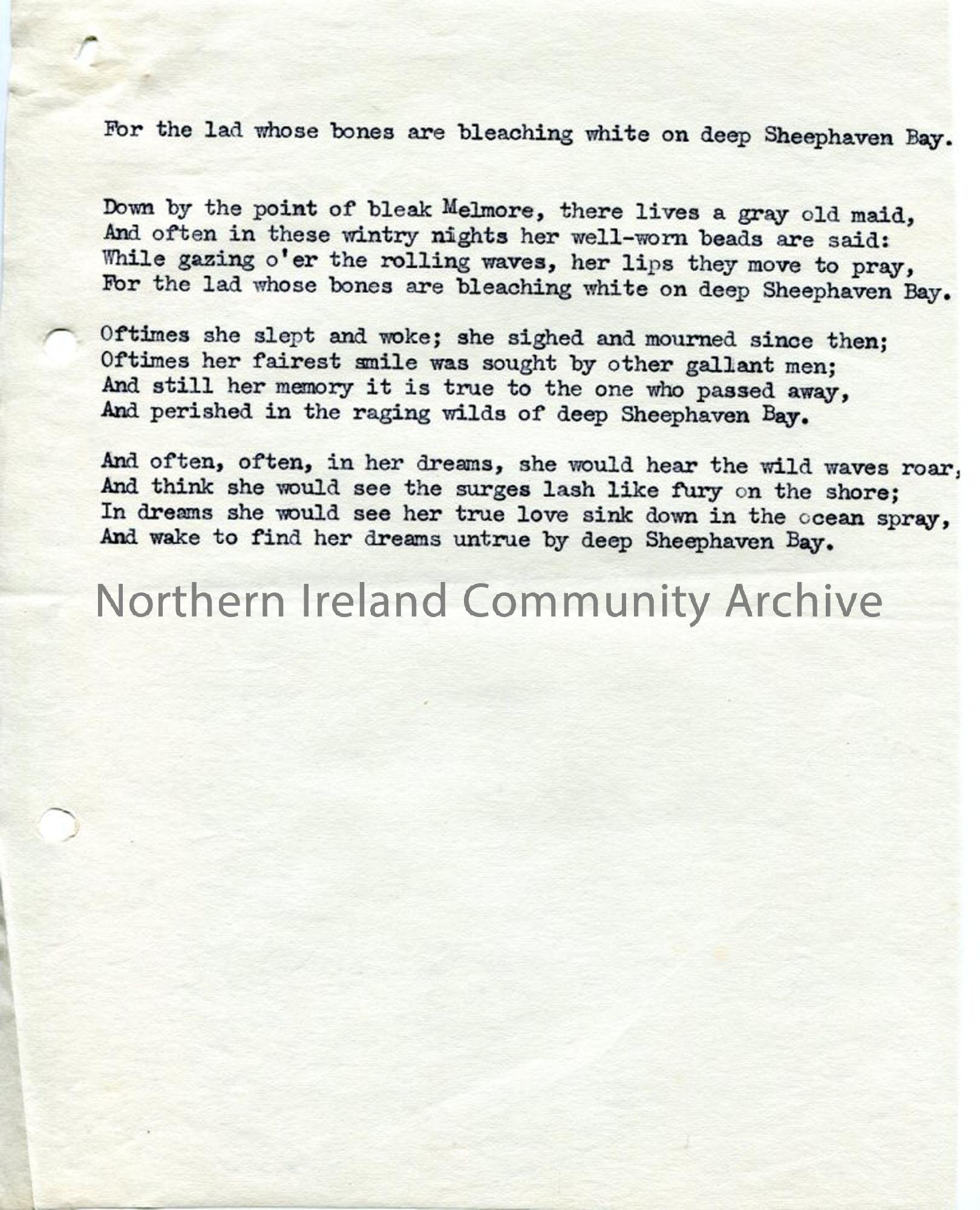 One of 2 pages of typed words to 'Deep Sheephaven Bay'.