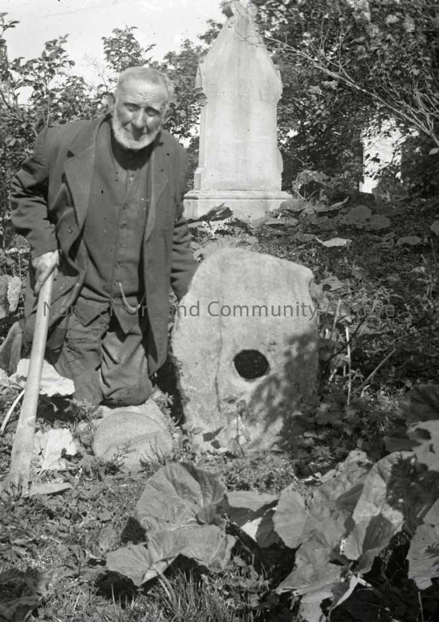 Entitled Derrykeighan Church - elderly man next to holestone in a churchyard. No 157 on Nature Slides inventory