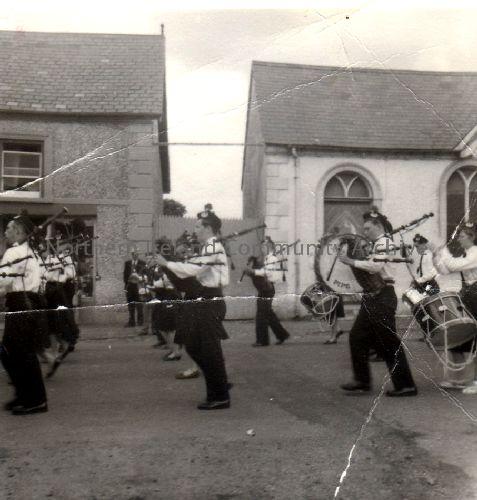 Dervock Pipe Band outside Loghheed's shop