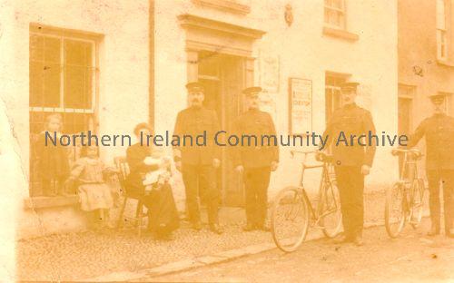 Dervock Police Station, with the sergeant and four officers of the Royal Irish Constabulary. The lady and the three children are the sergeant's family. At this time there was also a courthouse in Dervock.